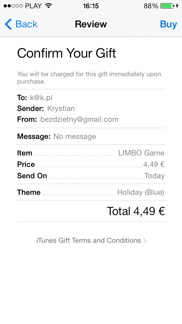 4. Wybierz szatę graficzną twojego prezentu, a na kolejnym ekranie sprawdź, czy wszystkie wprowadzone wcześniej dane się zgadzają. Jeżeli tak, naciśnij Buy aby zakończyć procedurę.