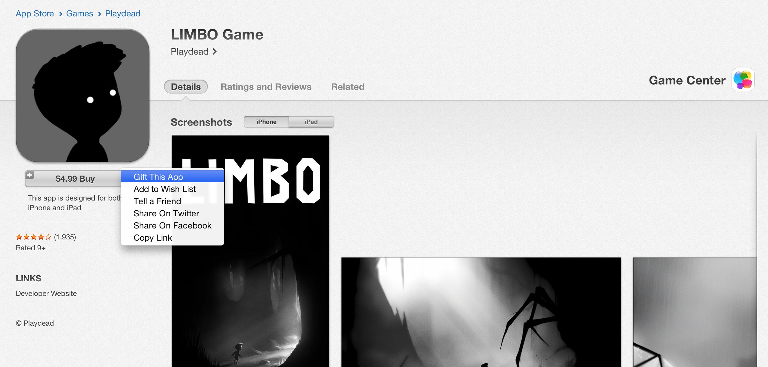 2. Przy przycisku Buy z ceną wybranej pozycji dostępna jest niewielka strzałeczka. Naciśnij ją, a następnie wybierz opcję Gift This App.