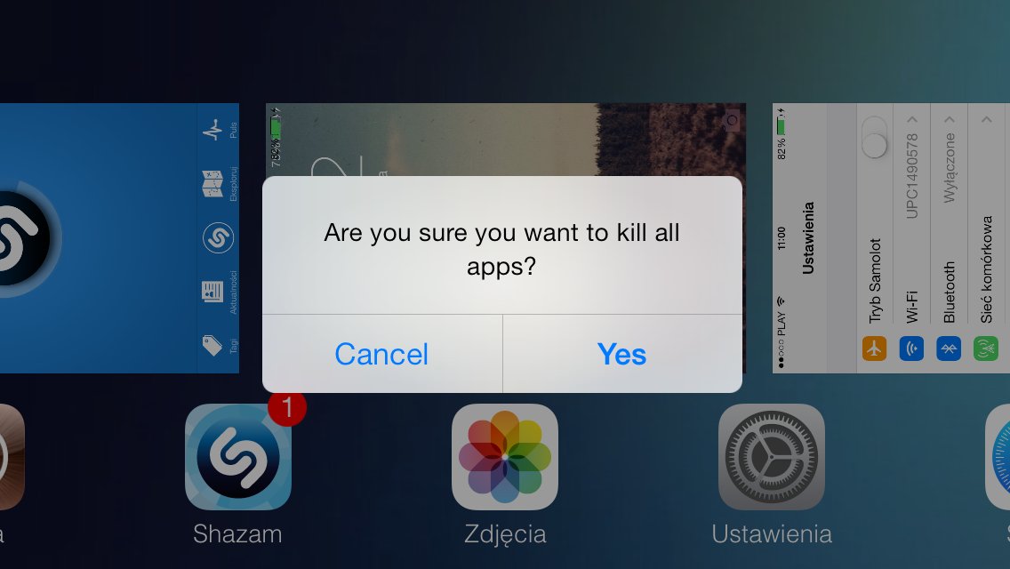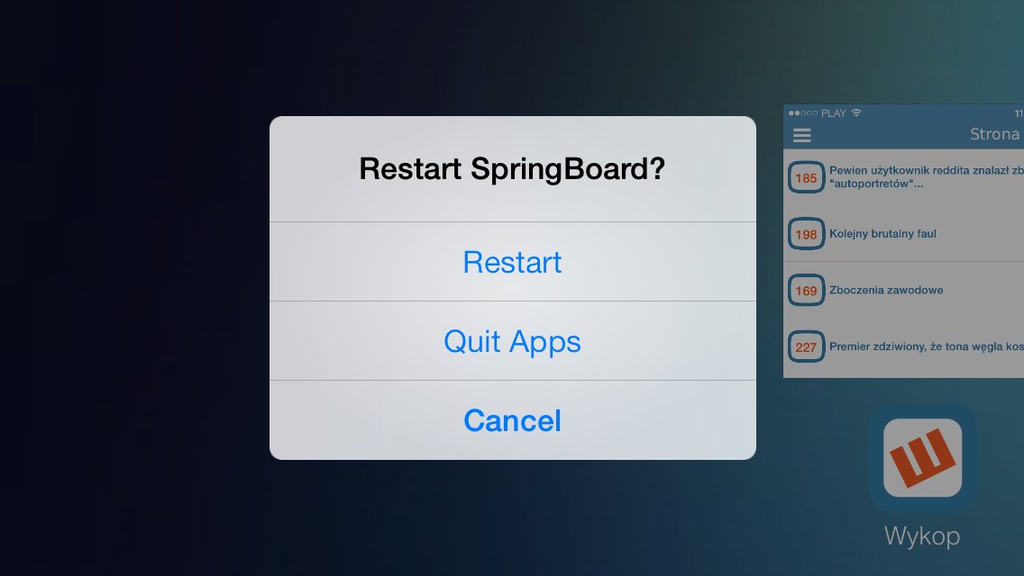 Korzystanie z SBSettings na iOS 7, z uwagi na obecność centrum sterowania, mija się nieco z celem, ale trzeba przyznać, że dostęp do przycisku służącego tzw. respingowi (restartowaniu „pulpitu” iOS-a bez konieczności restartowania urządzenia) był dosyć potrzebny. Aby w sprytny sposób przywrócić jego funkcjonalność wystarczy zainstalować SwitchSpring. Dzięki temu narzędziu szybko nie tylko wykonasz respring urządzenia, ale także zamkniesz wszystkie aplikacje działające w tle. Wszystko co należy zrobić w celu ustkutecznienia respringu to przewinąć na ekranie multitaskingu ekran home screena w górę. Spowoduje to wyświetlenie zapytania jak na screenie wyżej, a co za tym idzie – umożliwi szybkie wykonanie repsringu.