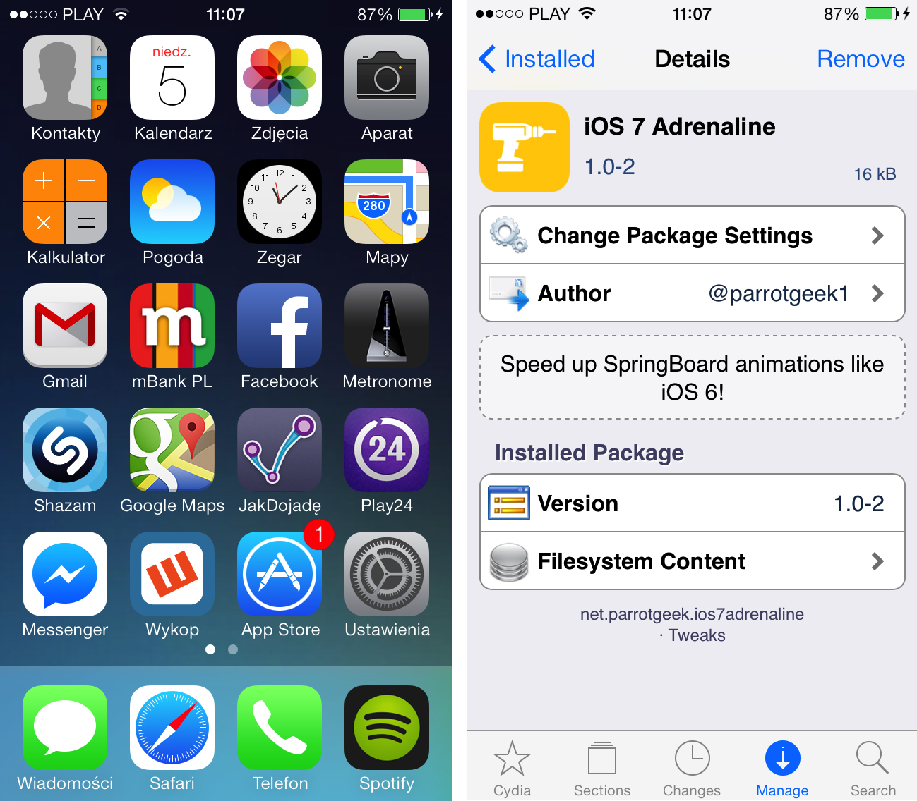 Chwilę po udostępnieniu jailbreaku dla iOS-a 7 w Cydii zaczęły się pojawiać aplikacje służące przyspieszeniu działania animacji systemowych. Zainstalowałem jedną z takich pozycji – iOS 7 Adrenaline – i okazało się, że prosta kombinacja z animacjami sprawia, iż przechadzając się po zakamarkach iOS-a 7 odnosi się wrażenie jakby się korzystało ze znacznie szybszego, lepiej reagującego na polecenia użytkownika systemu. Nie testowałem innych aplikacji zwiększających prędkość wyświetlanych w iOS-ie animacji, jednak iOS 7 Adrenaline w zupełności spełnia swoje zadanie i nie wymaga przy tym jakichkolwiek konfiguracji.