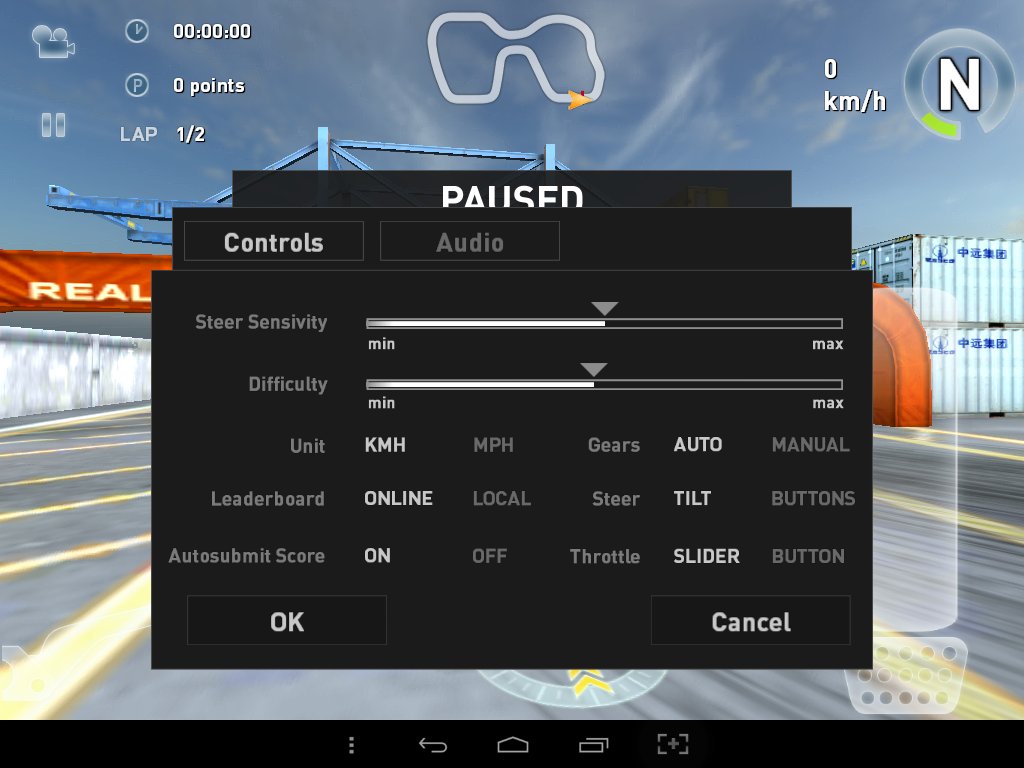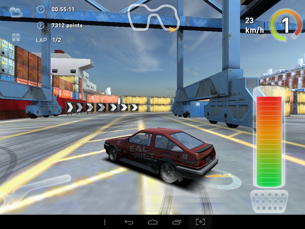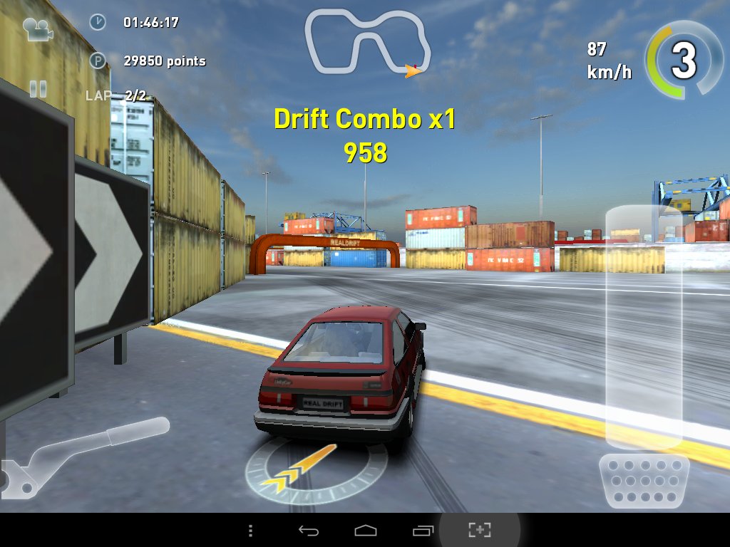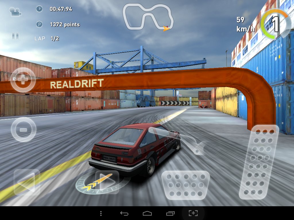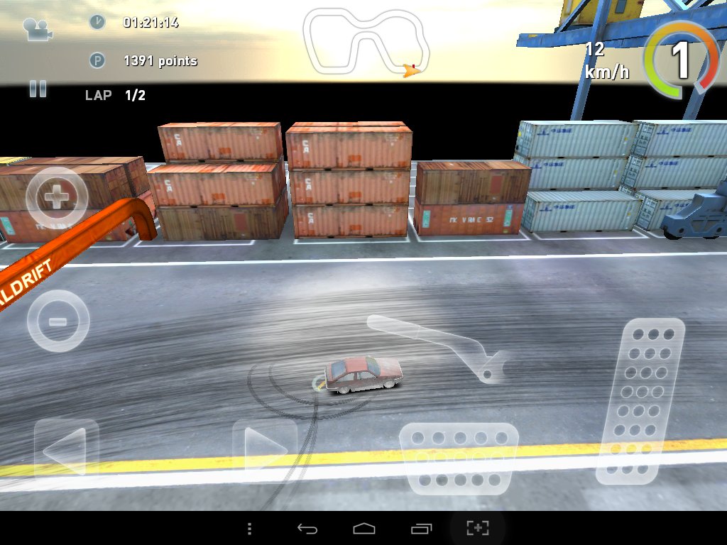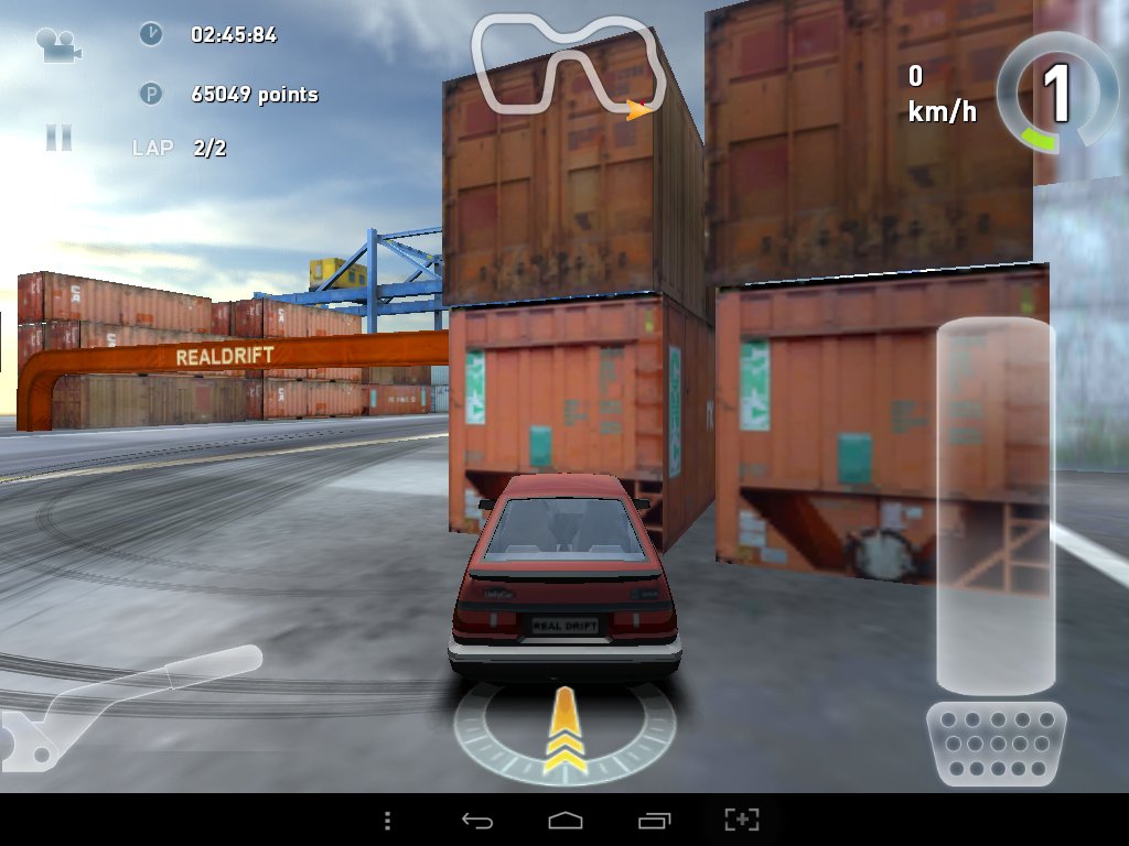 Skoro ma to być symulacja, to przydałaby się pełna kontrola nad samochodem. Do wyboru mamy więc regulowany gaz w postaci suwaka, ale też klasyczny przycisk, który działa zero jedynkowo. W przypadku skręcania, również możemy przełączać się pomiędzy akcelerometrem i przyciskami – generalnie trzeba znaleźć najbardziej odpowiednie dla siebie ustawienie. W każdym z ustawień mamy oczywiście jeszcze przycisk hamulca ręcznego, którym najłatwiej inicjować drift, a także możliwość wyboru manualnej lub automatycznej skrzyni biegów.