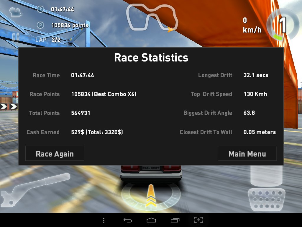 Fizyka jazdy, jak na mobilny symulator jest nadzwyczaj dobra, a jednocześnie przystępna dla każdego. Wszystko za sprawą paska regulującego trudność, dzięki któremu możemy płynnie określić nasze umiejętności i stopniowo je podnosić zwiększając poziom trudności. Najtrudniejszy poziom to prawdziwe wyzwanie – przetrzymana kontra rzuca samochód w drugą stronę, co jest praktycznie nie do opanowania, zbyt dużo gazu może obrócić samochód tyłem do kierunku jazdy i tak dalej. Nie lubię, kiedy w symulatorach zbyt łatwo się prowadzi i taką też możliwość daje mi Real Drift, choć wcale nie zmusza do tego wszystkich graczy – fajnie.