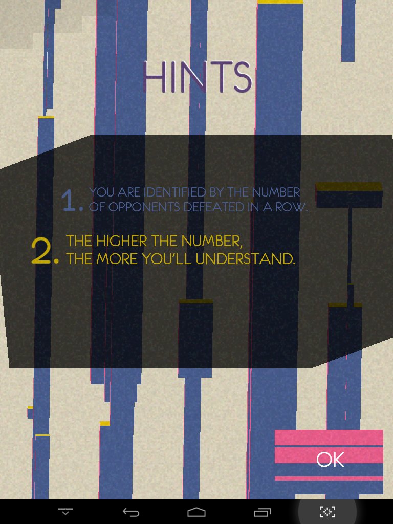 Dźwiękowi trochę brakuje. Zdaję sobie sprawę z tego, ze i tutaj developerzy chcieli postawić na minimalizm… ale rezultat nie jest zachwycający. Wyborom kolejnych sekcji menu towarzyszą proste puknięcia – te same, które usłyszymy wskazując elementy w trakcie rozgrywki. Uderzenie mieczem przeciwnika skutkuje charakterystycznym plaśnięciem, kojarzącym się z wbiciem noża w dorodny kawał mięsa. Przyjęcie ataku, z kolei, wywoła dziwaczny (i trochę irytujący) okrzyk rodem z bijatyk produkowanych w latach 90. Muzyki – brak.