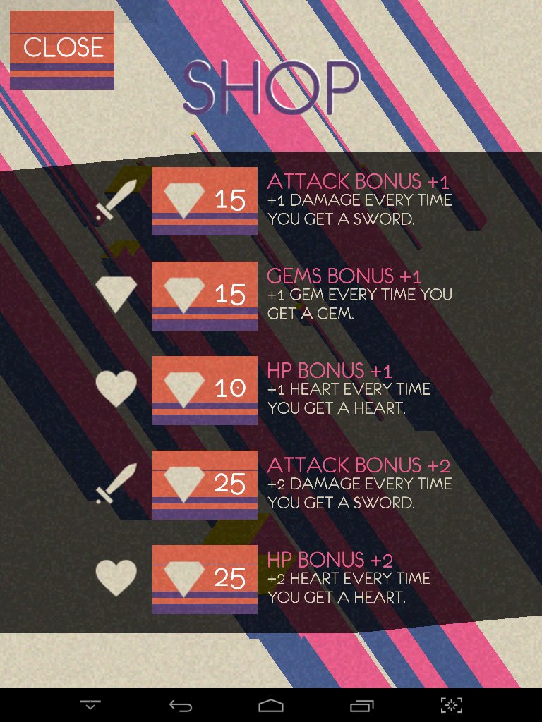 Ostatnim elementem są klejnoty, z wykorzystaniem których możemy kupować czary i rozmaite upgrade’y w faifowym sklepiku. Wśród obecnie dostępnych znajdują się m.in. bonusy do ataku i życia – zależne oczywiście od tego, ile drogocennych kamieni zechcemy na nie przeznaczyć.