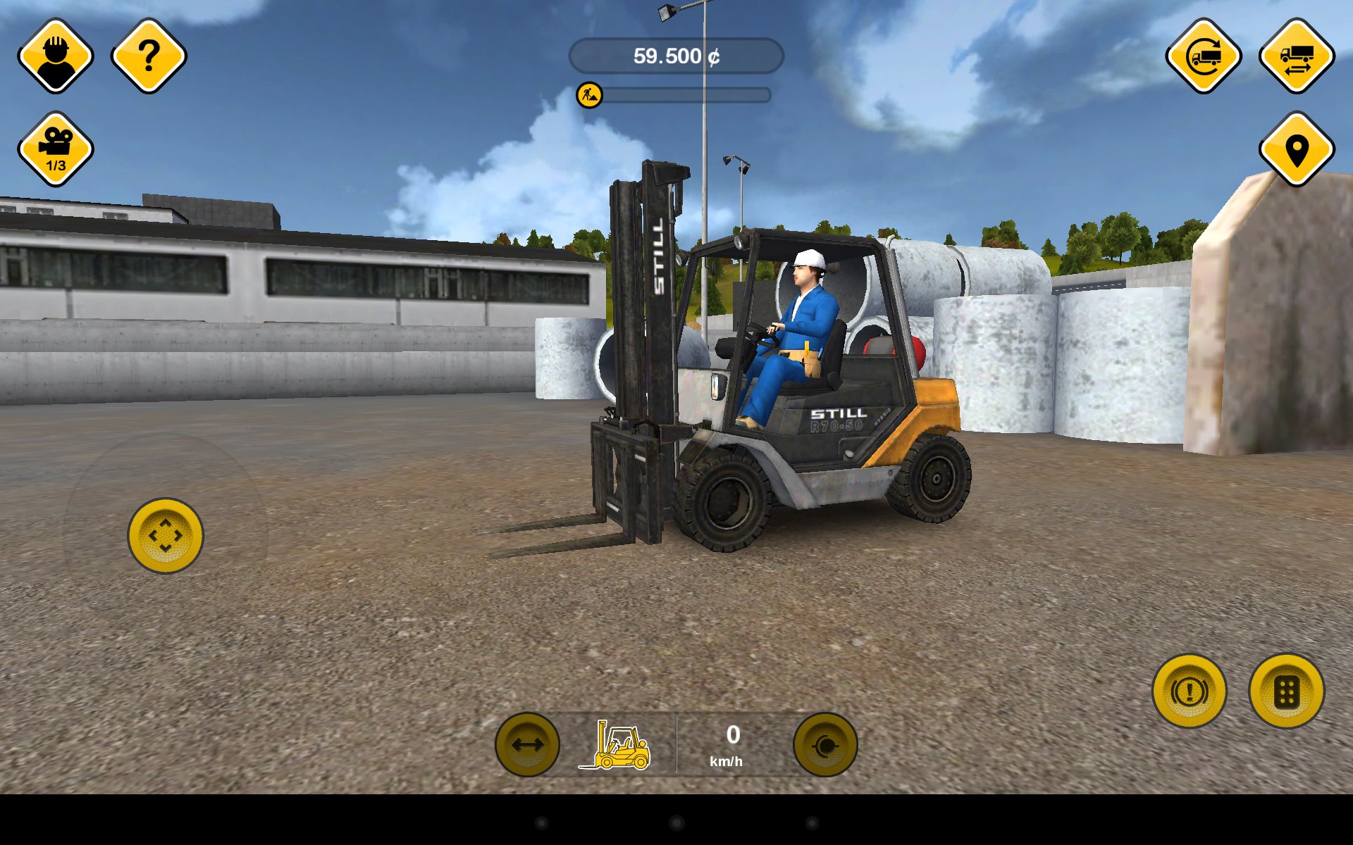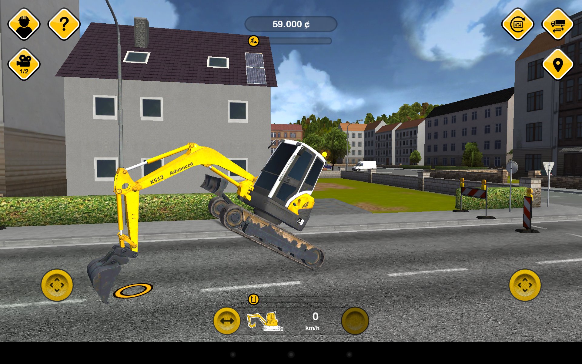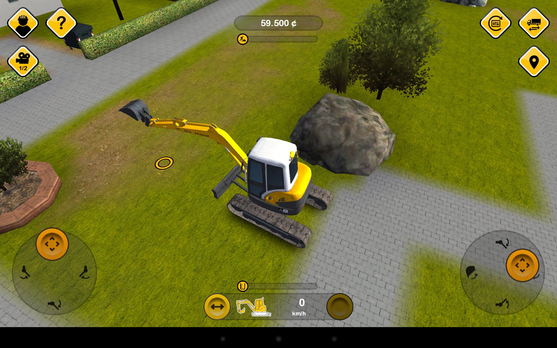 Każdy pojazd prowadzimy w inny sposób i, jeśli tylko jest on mobilny, to możemy używać go w dwóch trybach – jazdy i funkcji. Jazda ciężarówkami to nic szczególnie trudnego – sterujemy za pomocą suwaków lub przycisków i przechylania tabletu. Ciekawiej robi się, gdy przyjdzie nam sterować koparką na dwóch gąsienicach – mamy dwa suwaki, z których każdy odpowiada za prędkość jednej gąsienicy – jeśli chcemy jechać do przodu – wychylamy do końca oba „drążki”, jeśli chcemy skręcić – delikatnie zwalniamy ciąg w jednej gąsienicy, a chcąc obrócić się w miejscu przechylamy jeden suwak maksymalnie do przodu, a drugi do tyłu. Jestem w stanie uwierzyć, że podobnie steruje się prawdziwym pojazdem na gąsienicach, a kompletnie inny sposób sterowania, niż znany nam na co dzień, potrafi sprawić całkiem dużą frajdę jeśli już go opanujemy.