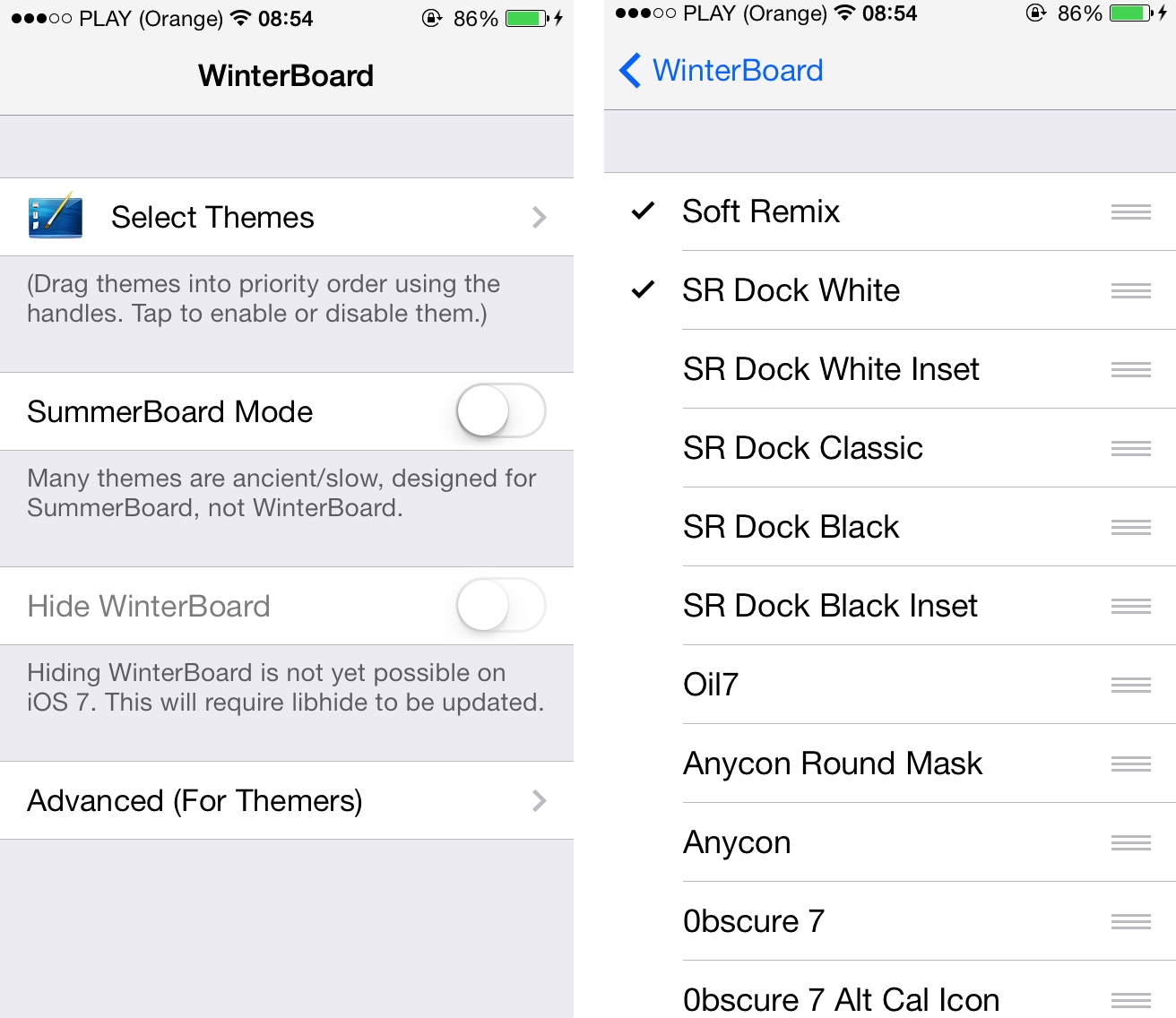 Przyjemna, prosta, kolorowa pozycja, która – podobnie jak Anycon – wprowadza nieznaczne pomniejszenie oraz większe zaokrąglenie w ikonach wszystkich aplikacji. Oprócz tego z Soft Remix for iOS 7 instalowanych jest kilka różnych styli docka – ja na screenie skorzystałem z opcji standardowej.