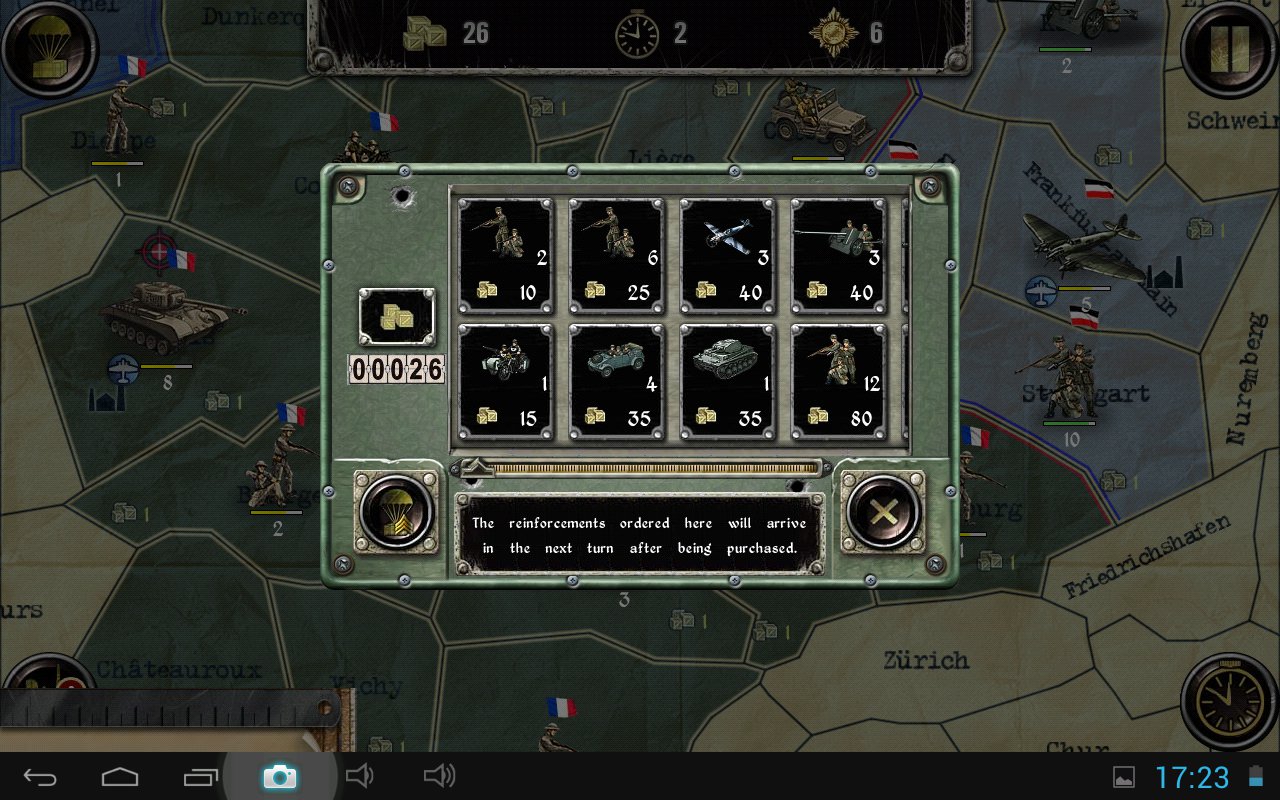 Jednostek nie jest tak wiele jak moglibyśmy przypuszczać. Do naszej dyspozycji oddano zaledwie oddziały żołnierzy piechoty, dwa rodzaje czołgów, tyle samo samolotów bojowych i dział. Aby wizualnie zwiększyć ich liczbę przygotowano specjalne pakiety upoważniające do wezwania na front np. sześciu czołgów w cenie niższej, niż przy zakupie ich osobno. W Strategy & Tactics: World War II nie ma jako takiej waluty – jest natomiast wynik gospodarczy, a przynajmniej dla mnie tak to wygląda. Każdy kraj na mapie podzielony został na mniejsze strefy. Zdobycie ich równoznaczne jest z przejęciem fabryk i zakładów przemysłowych, co skutecznie podnosi nasz wskaźnik uprzemysłowienia, a to z kolei skutkuje szybszą możliwością budowania nowych pojazdów bojowych tudzież szkolenia dywizji żołnierzy. Z drugiej strony, kiedy alianci odbiją nasze terytoria tracimy potencjał przemysłowy – i tworzymy armię znacznie wolniej.