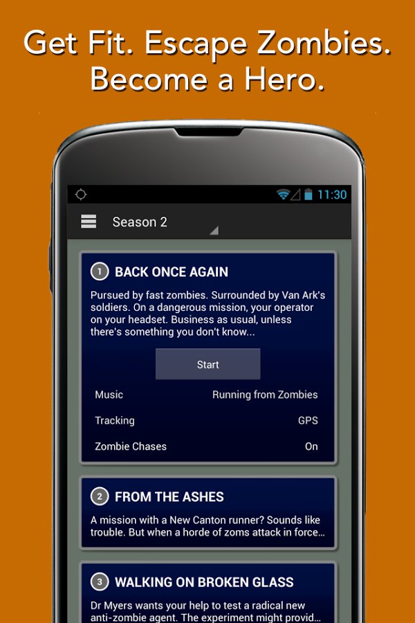 Omawiany tytuł to nic innego jak motywator do biegania. Po zainstalowaniu go na swoim smartfonie szybko zrozumiemy, że wcielamy się w jednego z ocalałych – większość ludzi wskutek działania nieznanego wirusa umarła, ale powróciła jako krwiożercze zombie. Człowiek w krótkim czasie został gatunkiem zagrożonym wyginięciem, natomiast niezainfekowani próbują żyć w ukryciu. Naszym zadaniem jest pomoc w rozwoju obozu ocalałych poprzez zdobywanie odpowiedniej ilości pożywienia i medykamentów leczniczych. To zaskakujące, ale Zombies, Run! to aplikacja z stawiająca na fabułę i kampanie dla pojedynczego gracza. Wszystkie misje opierają się o ten sam schemat: jest pewien dystans, który musimy przebiec. Dzięki wykorzystaniu modułu GPS, program doskonale wie jaką odległość udało nam się pokonać.