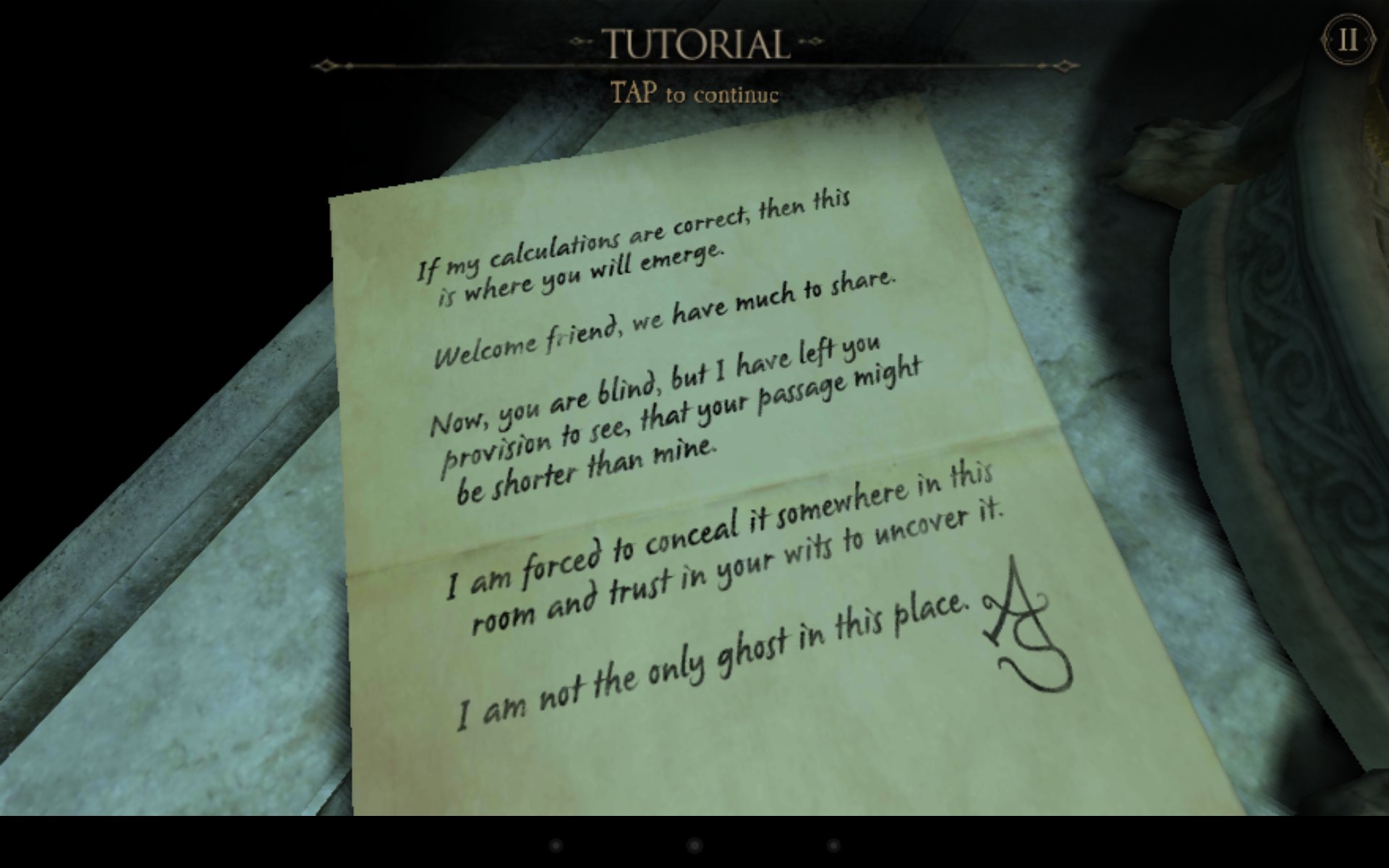 Nieodłącznym narzędziem w eksploracji jest specjalny wizjer odkrywający ukryte wskazówki. W tutorialu zauważymy na przykład urządzenie zapisujące kierunki świata jako specjalny kod, jednak nie wiadomo gdzie jest on ukryty. Spojrzenie przez soczewkę odkrywa tajemnicę – na liście od kogoś, kto twierdzi, że „nie jest jedynym duchem w tym miejscu”, ukryto właśnie to hasło – postępujemy wedle tej instrukcji i uruchamiamy mechanizm.