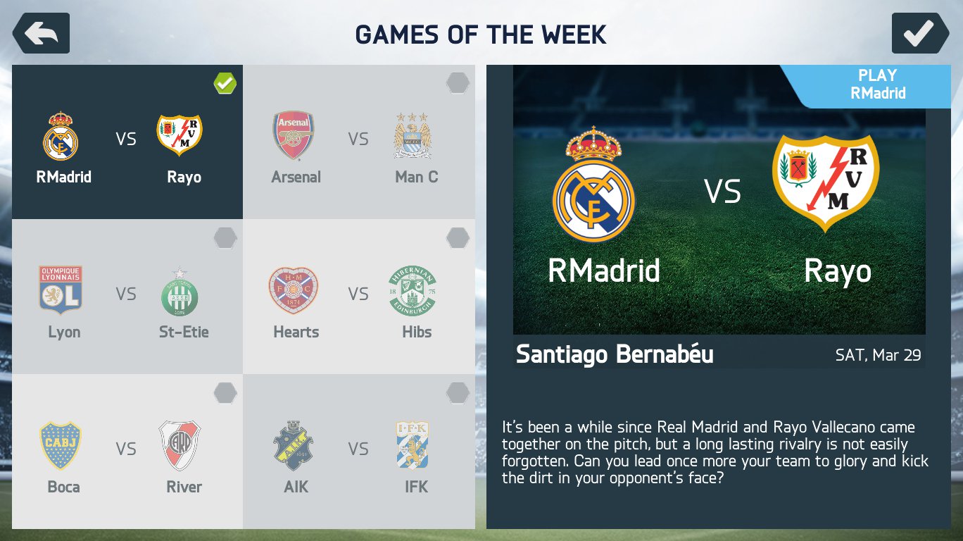 Panowie producenci ze studia EA bacznie monitorują najważniejsze wydarzenia z największych i najmocniejszych lig świata (Premier League, Liga BBVA, Bundesliga, Serie A oraz Ligue), pozwalając na wzięcie w nich udziału. Z tego co udało mi się zauważyć, raz na tydzień możemy pobrać nowe mecze poprzez aktywne połączenie internetowe. Jest ich dziewięć. Gracz może bez najmniejszych problemów wybrać „stronę konfliktu”, długość połowy i stroje zarówno naszej drużyny, jak i przeciwnika.