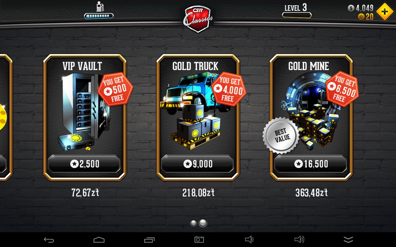 Wśród minusów umieszczam dość drogie płatności dodatkowe, choć na szczęście nie przymusowe, i fakt, że jeśli chcemy grę przejść bez wydawania pieniędzy, to w okolicach 4 tieru musimy się już nieźle, rutynowo, namęczyć. Wtedy z reguły gra zaczyna się nudzić, a na to samo cierpiała też niestety CSR Racing.