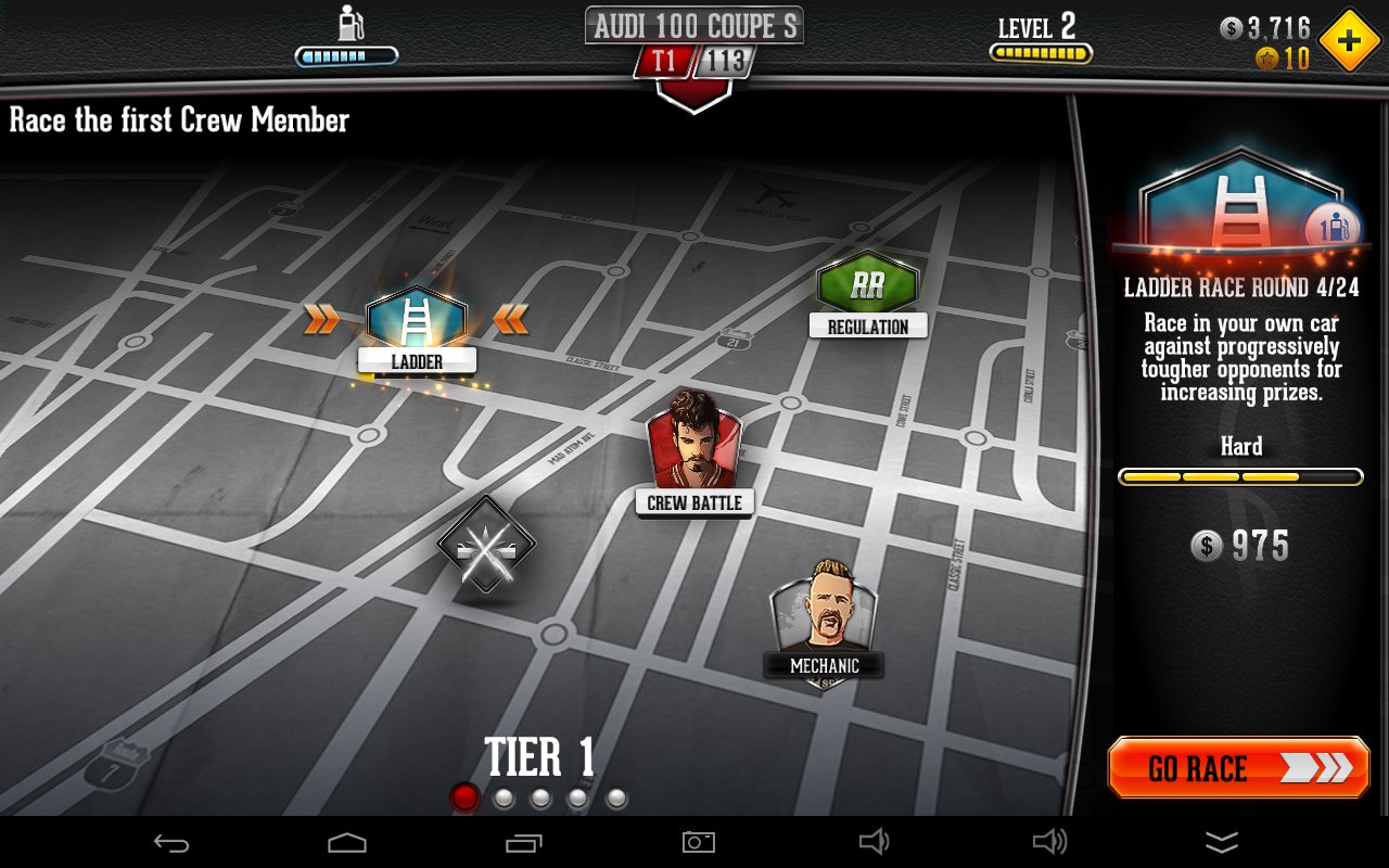 W grze, podobnie jak w CSR Racing, musimy udowodnić, że jesteśmy najlepszym kierowcą w mieście. W tym celu ścigamy się w podrzędnych imprezach zbierając fundusze na ulepszenia, a jeśli samochód spełni wymogi – stajemy do walki z jednym z członków teamu, który rządzi tą dzielnicą. Po kilku takich seriach dotrzemy do bossa.