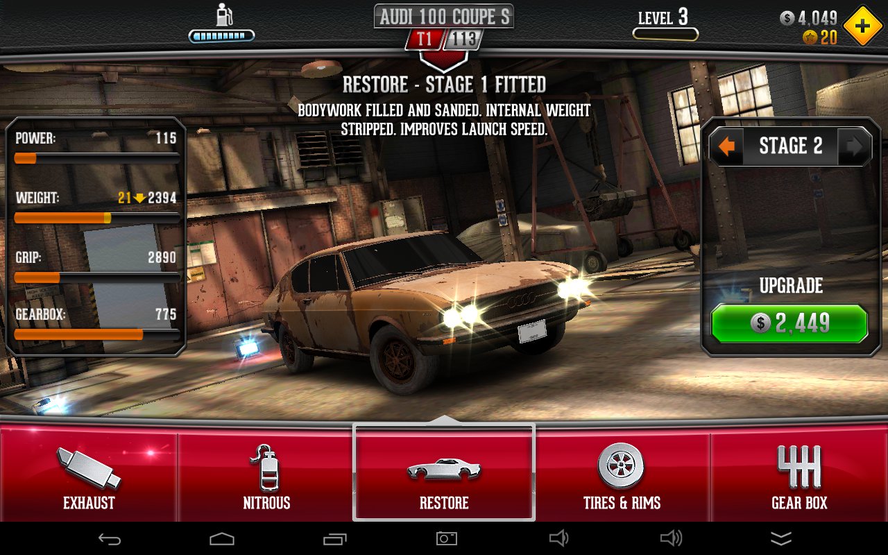 W wyścigach typu drag najważniejsza jest moc samochodu, ale niemal w równym stopniu co przeniesienie napędu i opony. Za odłożone pieniądze ulepszamy więc części w silniku, gaźnik, wydech, skrzynię biegów i opony z felgami. Dodatkowo, jak już wspomniałem wcześniej, instalujemy nitro, które da nam dodatkowy zastrzyk mocy.