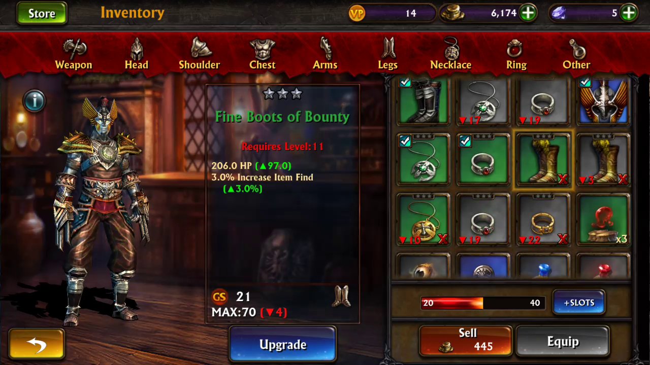 Co do wpływu na postać – gracz może wybrać jedną z trzech klas – mnicha, barbarzyńcę lub czarodziejkę. Po tej decyzji jednak nie będziemy dysponować żadnym drzewem rozwoju, ani przydzielać postaci dodatkowych punktów statystyk. Wszystko co możemy zrobić to wybór kilku umiejętności z których chcemy korzystać, i ubieranie znalezionego – lub kupionego – ekwipunku. I to właśnie dookoła ekwipunku toczy się cała gra. Przedmioty można polepszać zużywając zdobyte złoto, łączyć ze sobą w mocniejsze kombinacje, ewoluować i sprzedawać. Autorzy dyskretnie jednak sugestywnie zachęcają do korzystania z loterii fantowej kosztującej drobne kwoty realnej gotówki, która prowadzi do zdobycia rzadkich i potężnych części ekwipunku. Bez nich postęp w grze jest powolny i nieco monotonny, jednak możliwy.