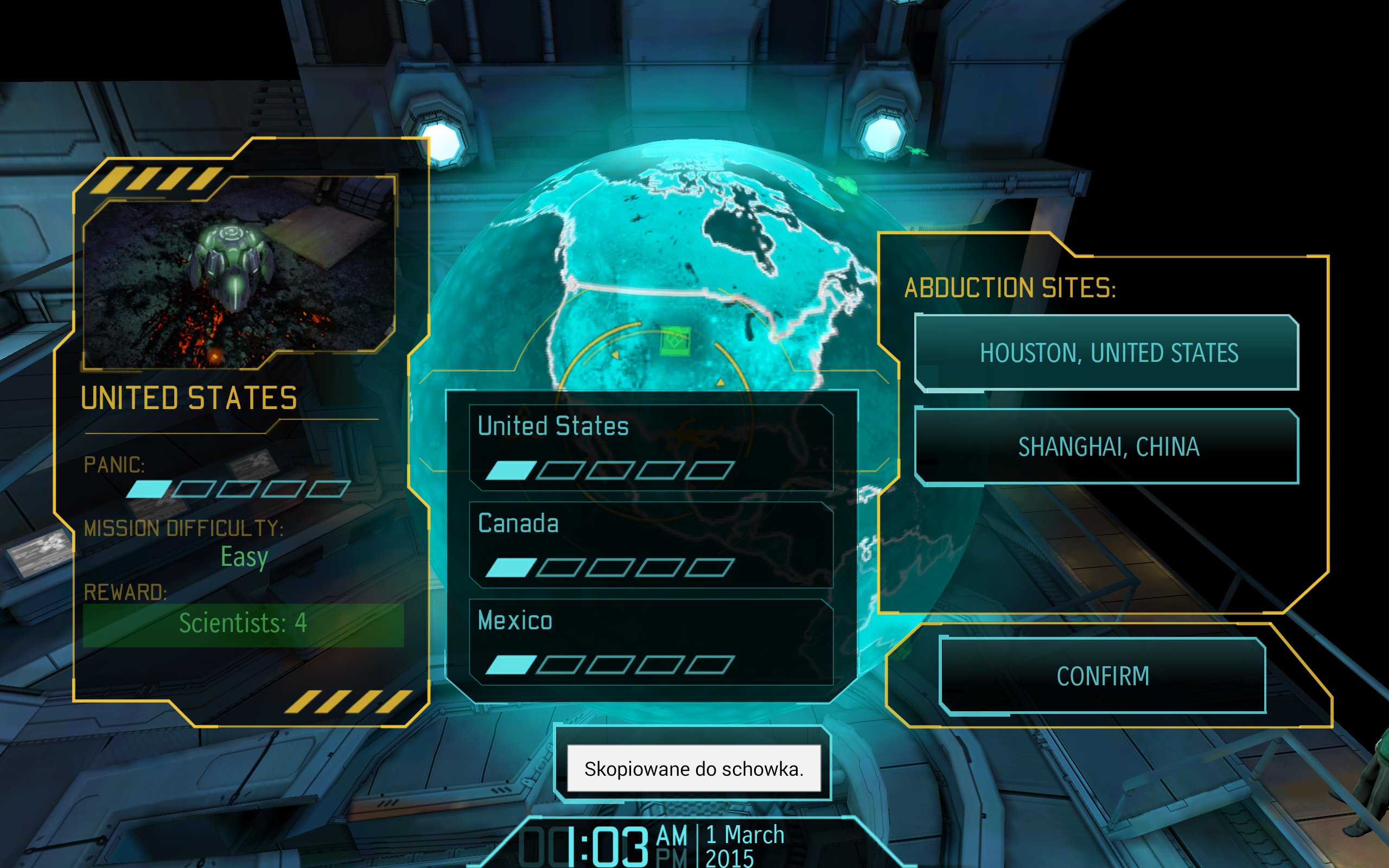 W związku z aktualną sytuacją narasta panika wśród mieszkańców naszego globu. Możemy sprawdzać jej poziom i wedle tego planować kolejne działania – często musimy zwyczajnie wybrać, któremu państwu pomóc, bo dwóm na raz nie jesteśmy w stanie. Kraje wspierają X-COM takimi środkami, na jakie je stać – wysyłają naukowców, inżynierów, pieniądze itp., ale jeśli panika będzie narastać, a my im nie pomożemy, wycofają się zabierając cenne dla nas wsparcie.