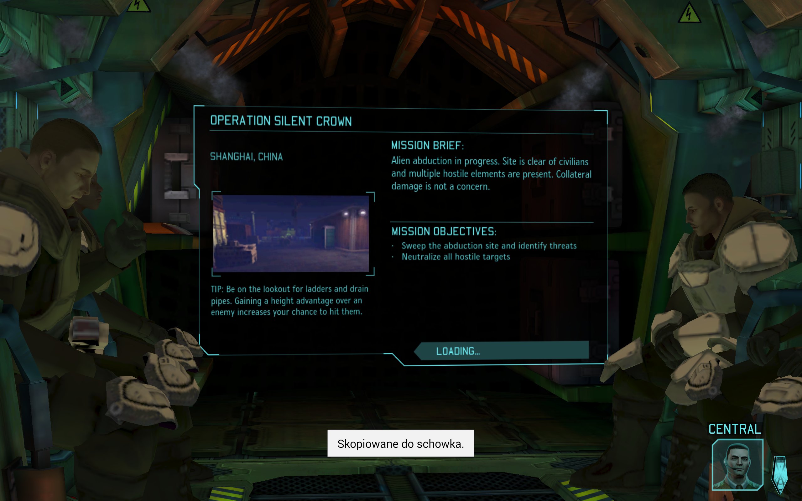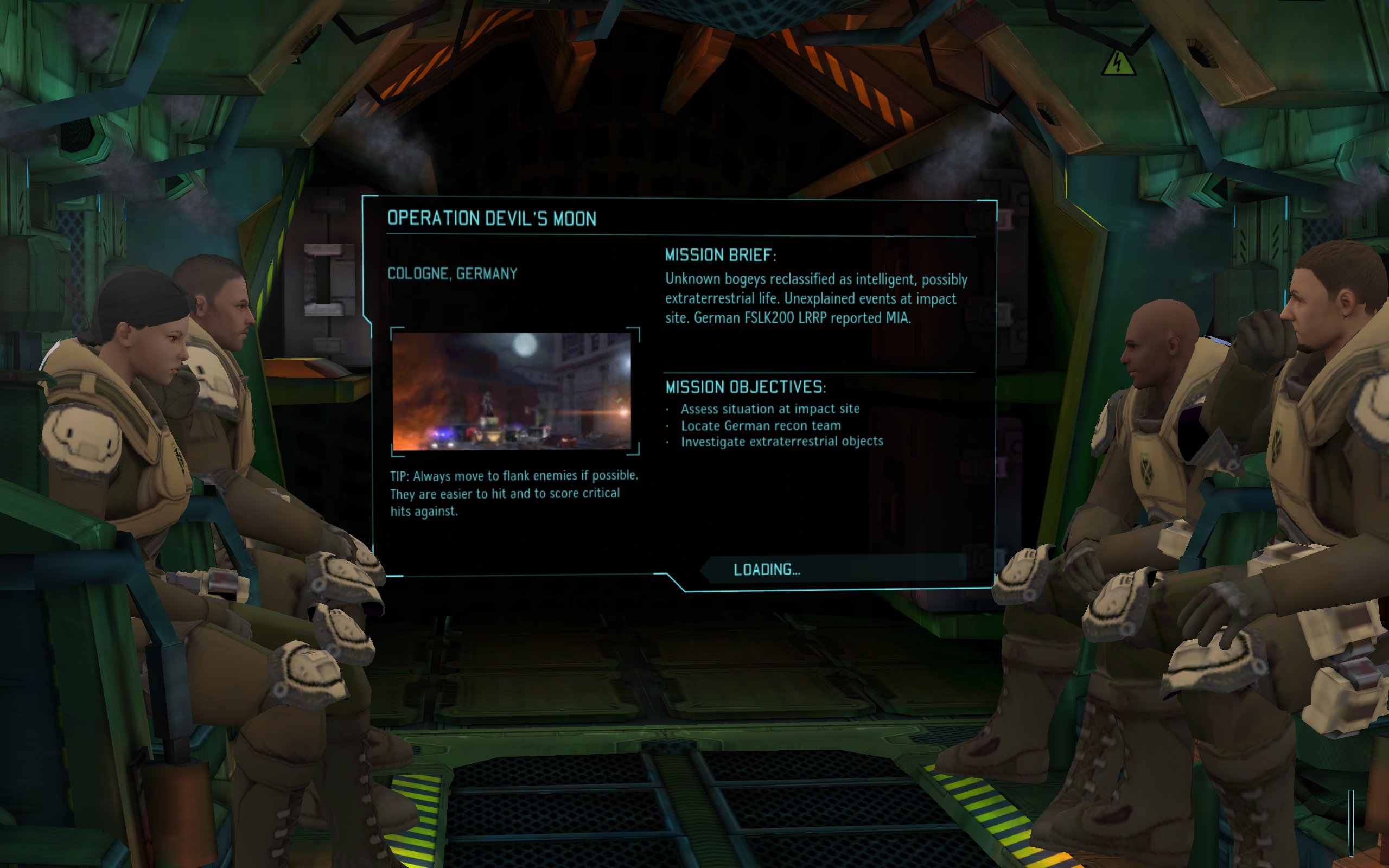 W pierwszej misji obejmujemy kontrolę nad pierwszym oddziałem X-COM, składającym się z Japonki, Argentyńczyka, Rosjanina i, oczywiście, Amerykanina. Lądujemy w Kolonii, w Niemczech na miejscu rozbicia się niezidentyfikowanego obiektu, który poranił ciekawskich przechodniów. Naszą misją jest ocenić panującą tam sytuację, spotkać się z niemieckim oddziałem rozpoznawczym i zbadać pozaziemskie obiekty.
