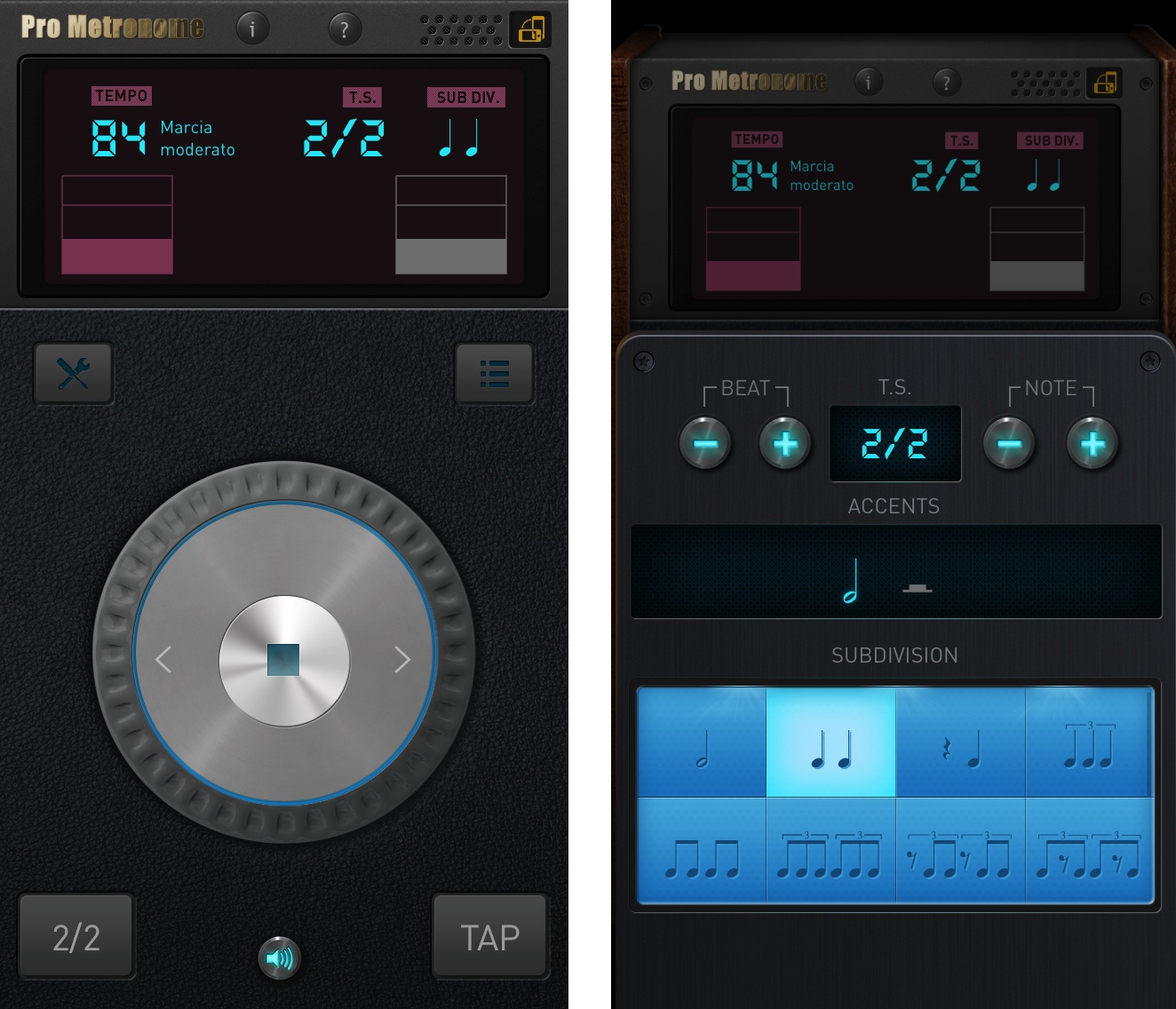 Umówmy się – nie można być muzykiem bez metronomu, zwłaszcza jeżeli dopiero stawia się w tym światku kroki. A do tego celu w przypadku iPhone’ów najlepiej nadaje się Pro Metronome. Owa aplikacja, poza oczywistym wystukiwaniem rytmu według wskazanego tempa (wyrażanego w BPM), w darmowej wersji umożliwia: