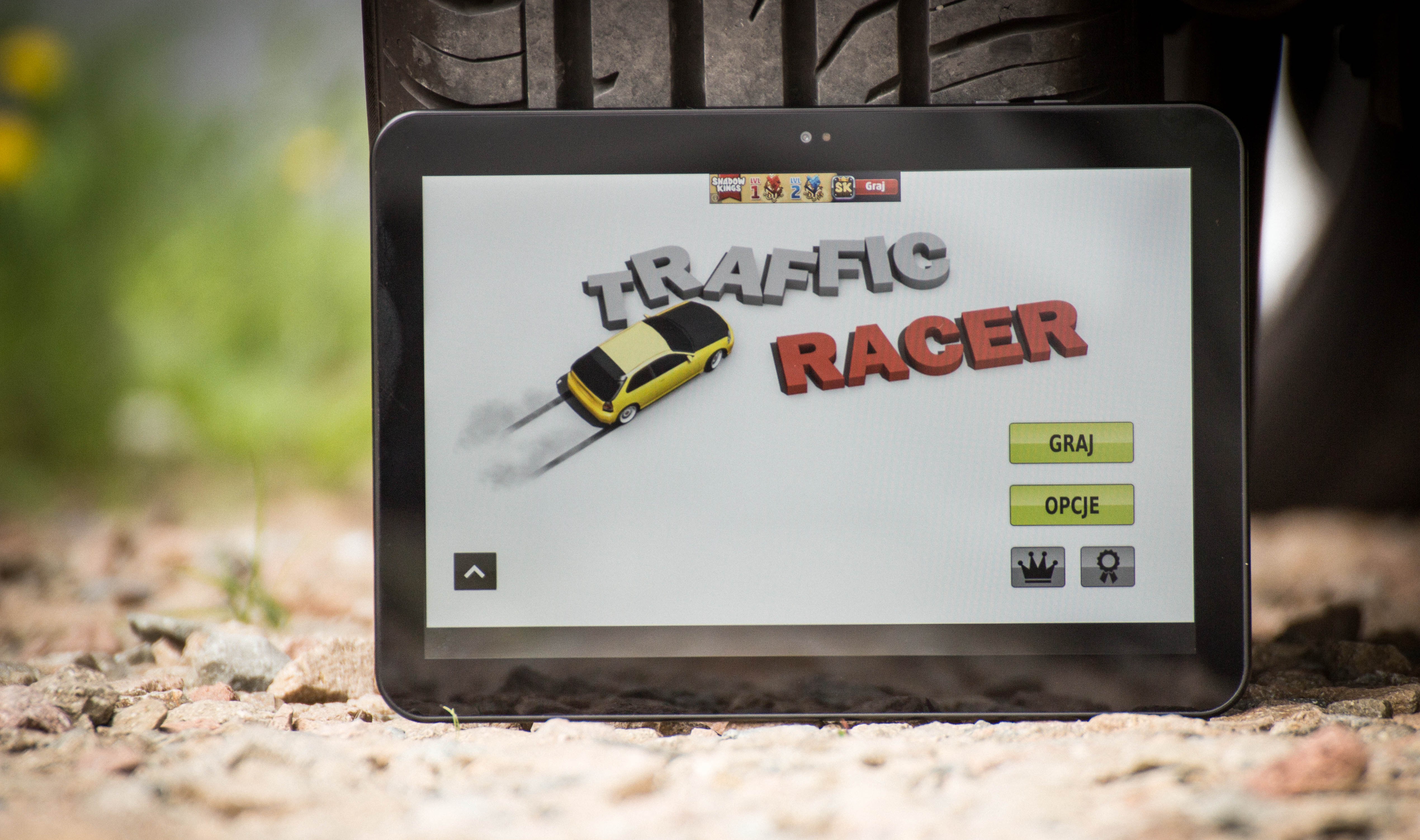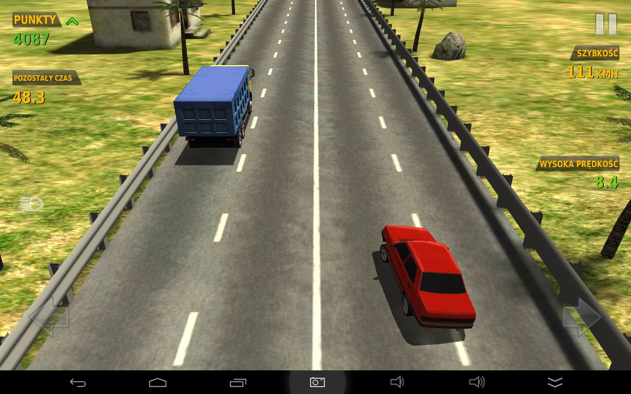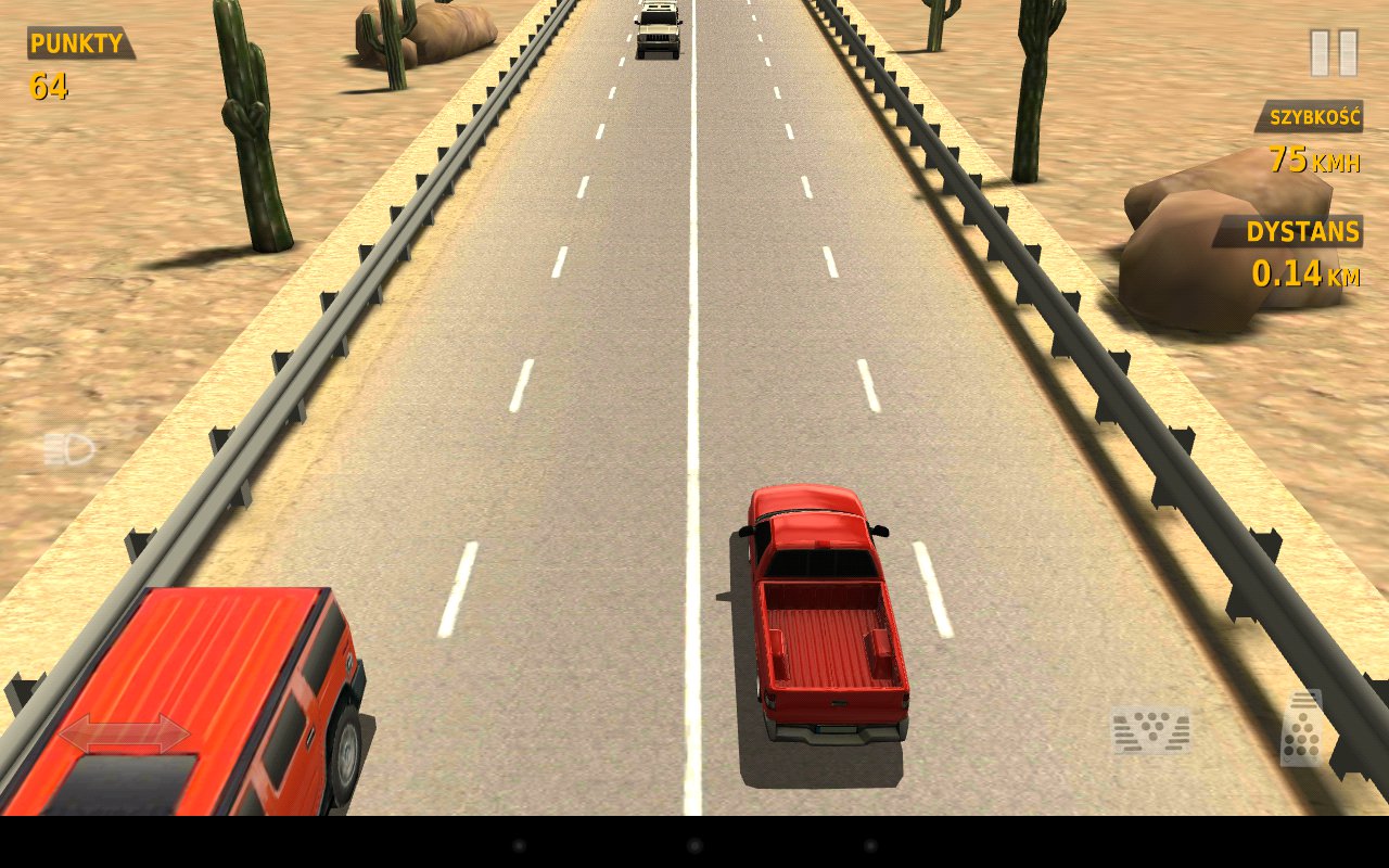Z początku używałem metody z użyciem akcelerometra, ale w tym wypadku gra była dość nudna, a przy tym raczej trudno było utrzymać prosty kierunek jazdy. Lepszą opcją jest chyba sterowanie ekranowymi przyciskami, choć tutaj mamy też dwie możliwości – analogowo i zero-jedynkowo. Dla mnie najlepszym układem były dwie ekranowe strzałki i automatyczny gaz.