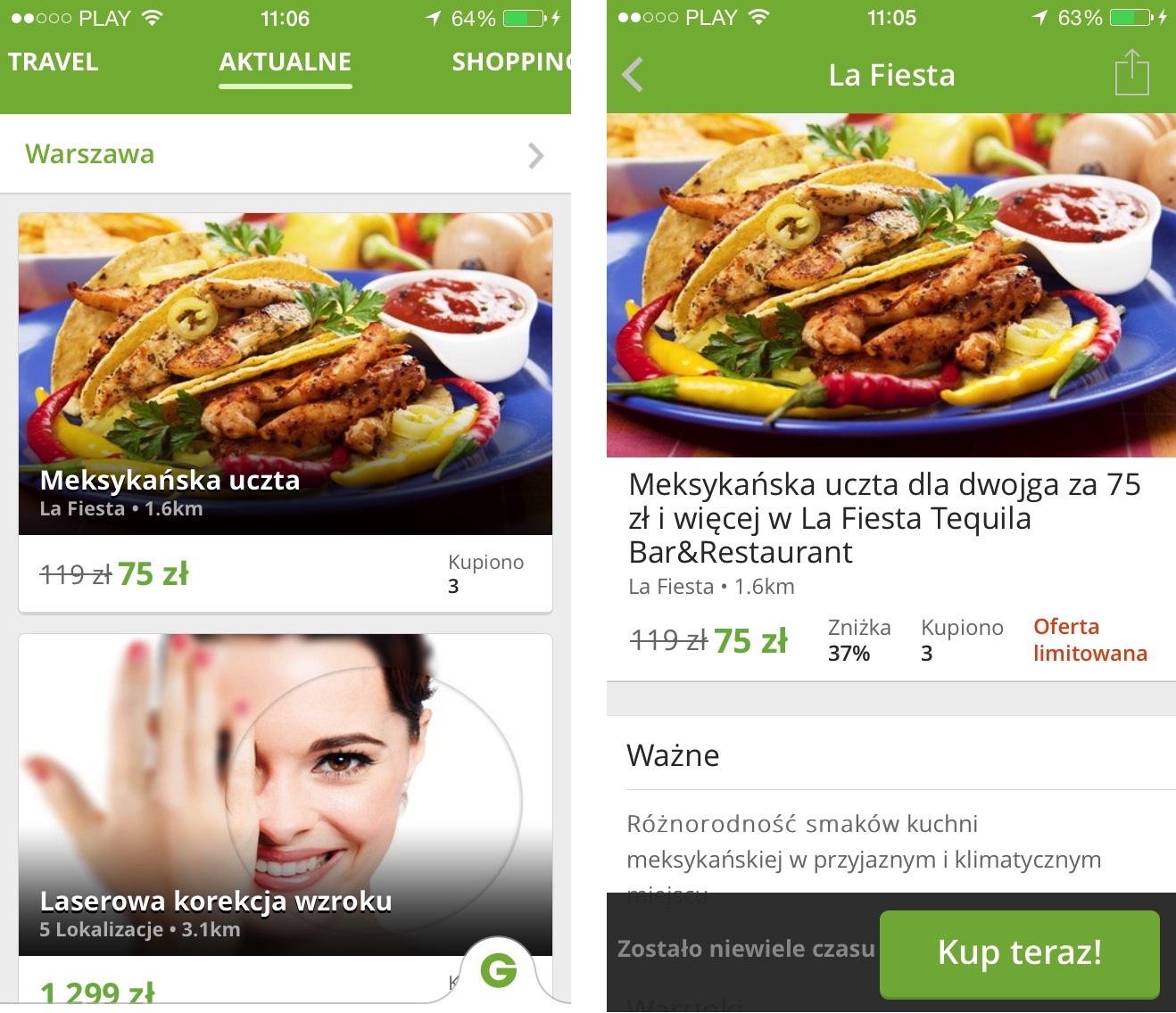 Choć szał na Groupona moim zdaniem nieco minął, to jednak serwis nadal działa i ma się świetnie. Jeżeli ktoś nie wie, jest to portal internetowy, na którym znaleźć znajdziesz rozmaite promocje i okazje, dzięki którym można jest taniej pojechać na wycieczkę, wyhaczyć nietypowo tanie bilety do kina, udać się po promocyjnej cenie do SPA, zjeść tani i dobry obiad lub kupić popularne buty. Działa to w ten sposób, że firma udostępnia Grouponowi specjalne „kupony”, które następnie serwis udostępnia w ograniczonej ilości użytkownikom. Zasada ich zdobycia jest prosta – kto pierwszy, tym lepszy. Aplikacja dla iPhone’ów w przejrzysty sposób prezentuje grouponowe promocje. Wszystkie oferty zostały podzielone na trzy działy: Travel, Aktualne oraz Shopping. Po określeniu swojej miejscowości w Aktualnych pojawią się odpowiednie dla niej oferty. Na ekranie głównym wyświetlana jest odległość do danego punktu, ile osób skorzystało z danego kuponu oraz ile zapłacisz za daną usługę czy produkt po promocyjnej cenie.