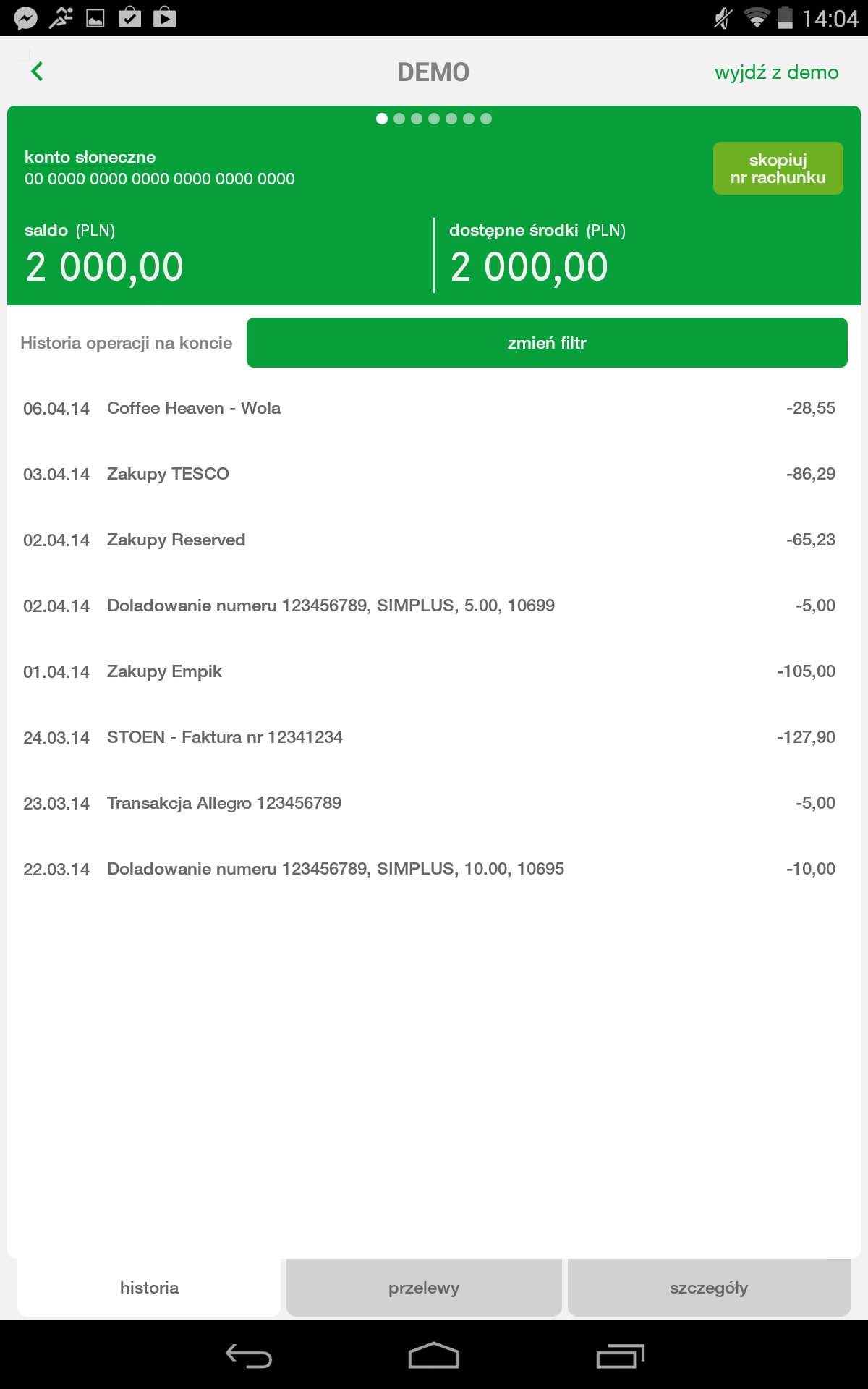 Podglądając stan konta od razu zobaczymy historię transakcji, a przechodząc na kolejne karty, wykonamy przelew i sprawdzimy szczegóły rachunku. W każdym momencie możemy szybko skopiować numer rachunku i wysłać go znajomemu, który akurat ma u nas dług.