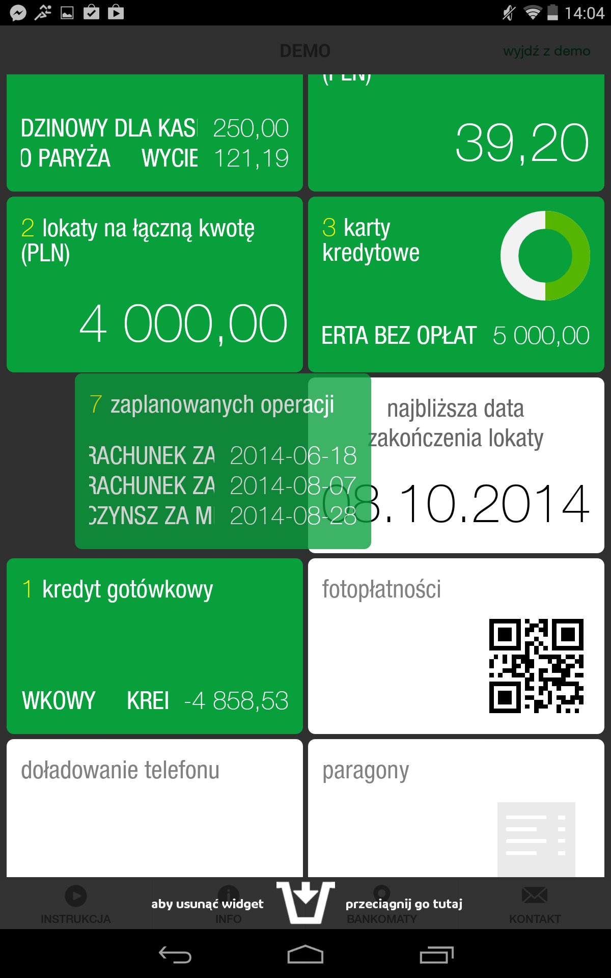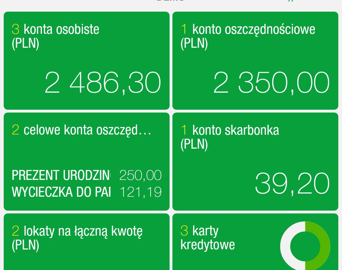Po zalogowaniu do aplikacji ukaże się nam ekran główny złożony z kafelków przypominających te z Windowsa 8. Możemy ustawiać je w dowolnej kolejności, usuwać i dodawać nowe. Na kafelkach widzimy od razu wszystkie interesujące nas informacje – stan poszczególnych kont, zadłużenie na karcie kredytowej, kredyty, lokaty czy datę zakończenia najbliższej lokaty.