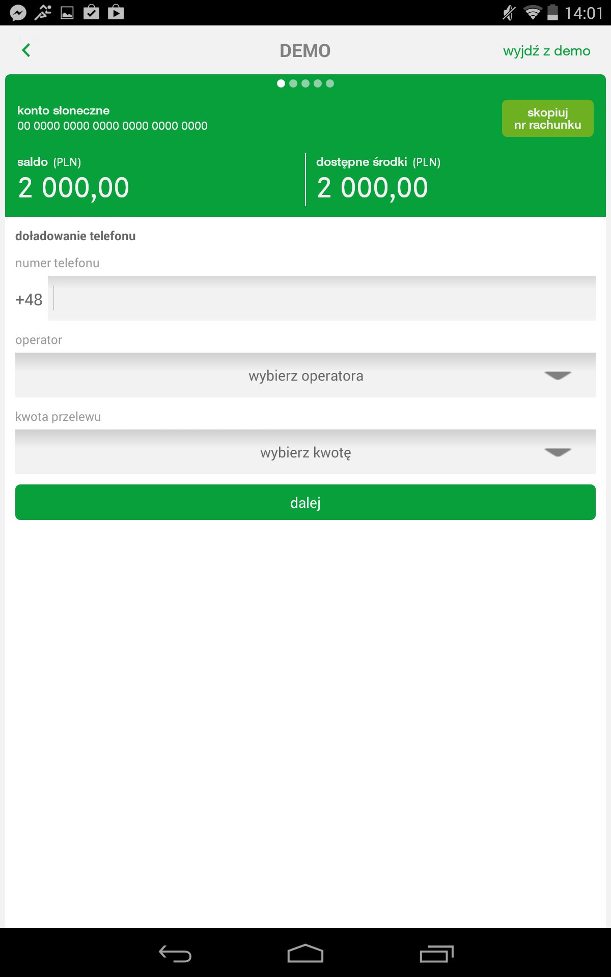 W bardzo łatwy sposób doładujemy też telefon. Wystarczy wybrać odpowiednią opcję, wpisać numer telefonu, wybrać operatora i podać kwotę doładowania. To może żadna nowość, ale zawsze dobrze móc szybko doładować telefon córce na wakacjach, która wydzwoniła całą kartę.