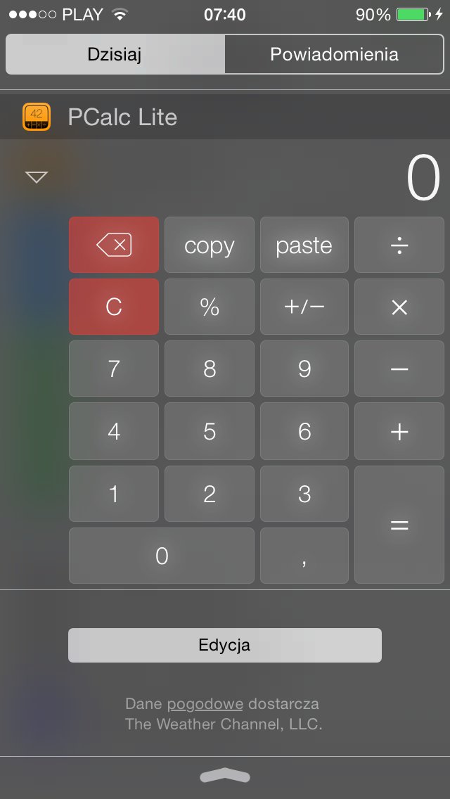PCalc również jest aplikacją, która powstała jeszcze przed iOS-em 8, ale nie przeszkadza jej to w czerpaniu garściami z nowości najnowszego oprogramowania. PCalc jest zaawansowanym kalkulatorem, który wyglądem bardzo przypomina ten z iOS-a 7 oraz 8. Różnica polega na tym, że oferuje on znacznie więcej funkcji matematycznych oraz pozwala zmieniać szaty graficzne. Najważniejszą jednak funkcją PCalc jest to, że można go w minimalistycznej formie ulokować na ekranie Dzisiaj, dzięki czemu dostęp do kalkulatora będzie jeszcze wygodniejszy niż dotychczas.