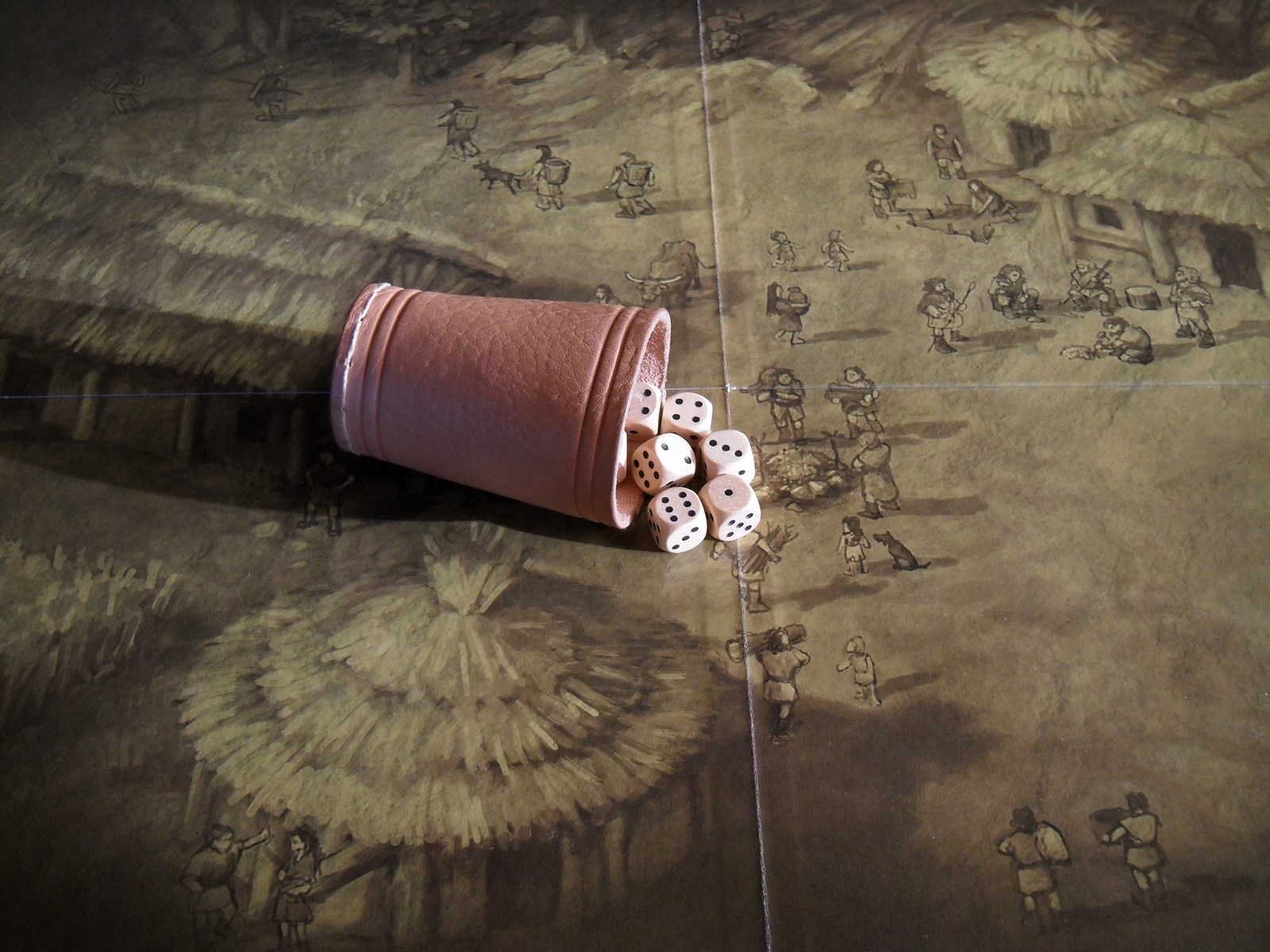 Swoich współplemieńców wysyłać możemy do różnych miejsc w wiosce i poza nią. W obrębie osady, są trzy lokacje. Chata, która pozwoli nam powiększyć liczebność plemienia, pole, dzięki któremu zyskujemy stały dostęp do żywności oraz narzędziownia dająca nam narzędzia przydatne poza wioską. A tam czekają kolejne wyzwania. Możemy ruszyć na polowanie albo udać się po surowce (drewno, glinę, kamień i złoto). Surowce pozwolą na budować nowe chaty lub pozyskać karty cywilizacji. Istnieją także ograniczenia dotyczące liczby osób w danej lokacji, co determinuje zarówno dana lokacja jak i to, ilu graczy zasiada do rozgrywki. Tak w skrócie wyglądają założenia mechaniki worker placement wykorzystanej w grze. Wspomniałem jednak jeszcze o kostkach….