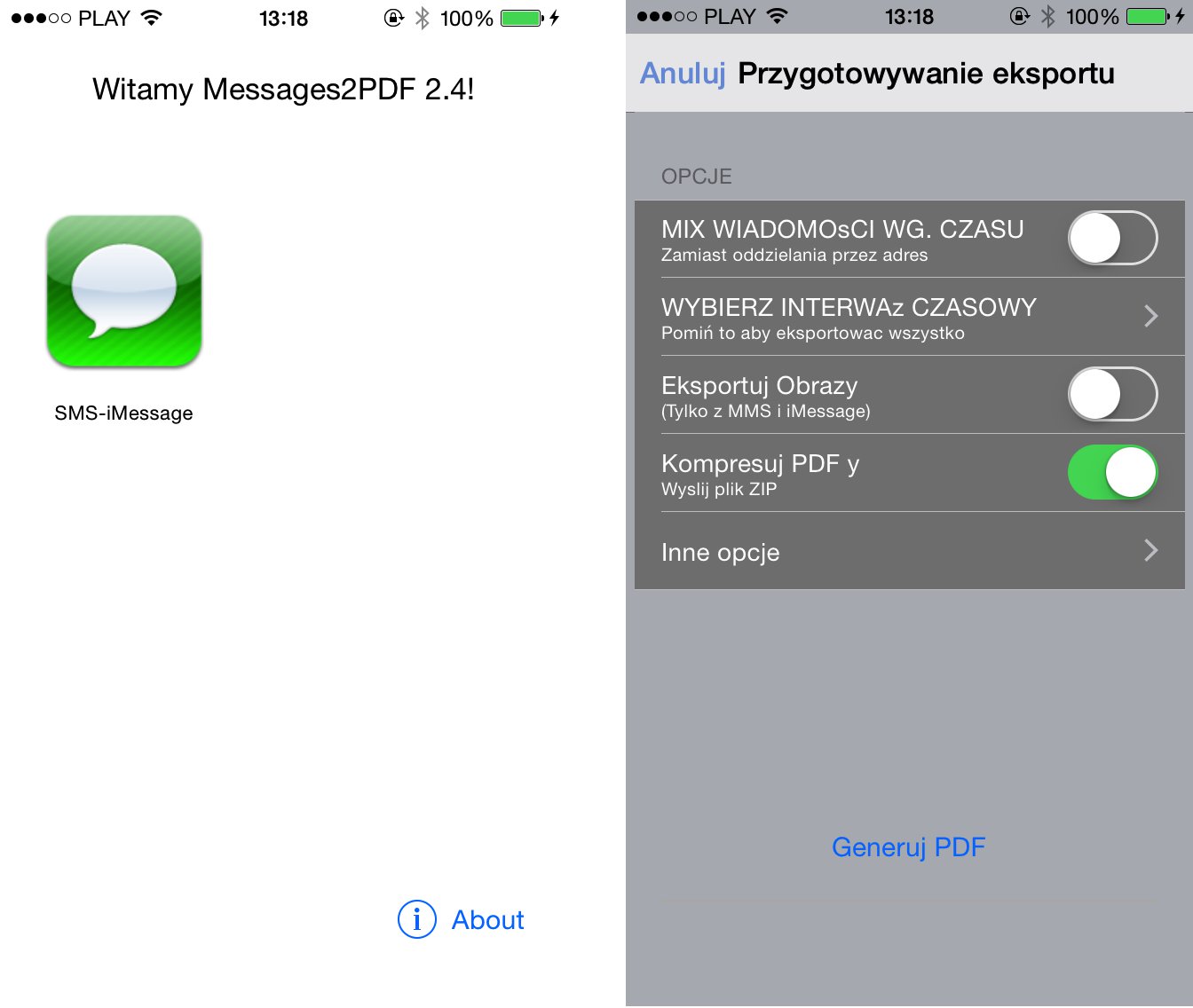 Messages2PDF jest narzędziem wyjątkowo prostym w obsłudze. Po jego uruchomieniu należy wybrać numer telefonu, z którym prowadziliśmy interesującą nas rozmowę, następnie określamy takie opcje jak eksportowanie również obrazów, czy chcemy aby plik wyjściowy był spakowany do skompresowanego archiwum lub czy chcemy eksportować całą bazę, czy tylko pewien okres. Gdy te informacje zostaną ustalone, a ty naciśniesz Generuj PDF, aplikacja utworzy żądany plik, który następnie pozwoli zapisać w telefonie lub wysłać mailem.