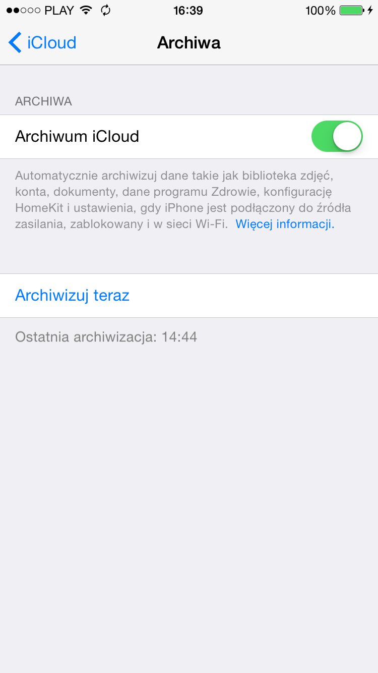 Aby wykonać kopię zapasową w iCloud wejdź kolejno w Ustawienia > iCloud > Archiwum i na samym dole naciśnij przycisk Archiwizuj teraz. Upewnij się, że telefon jest podłączony do źródła energii oraz znajdujesz się w zasięgu Wi-Fi.