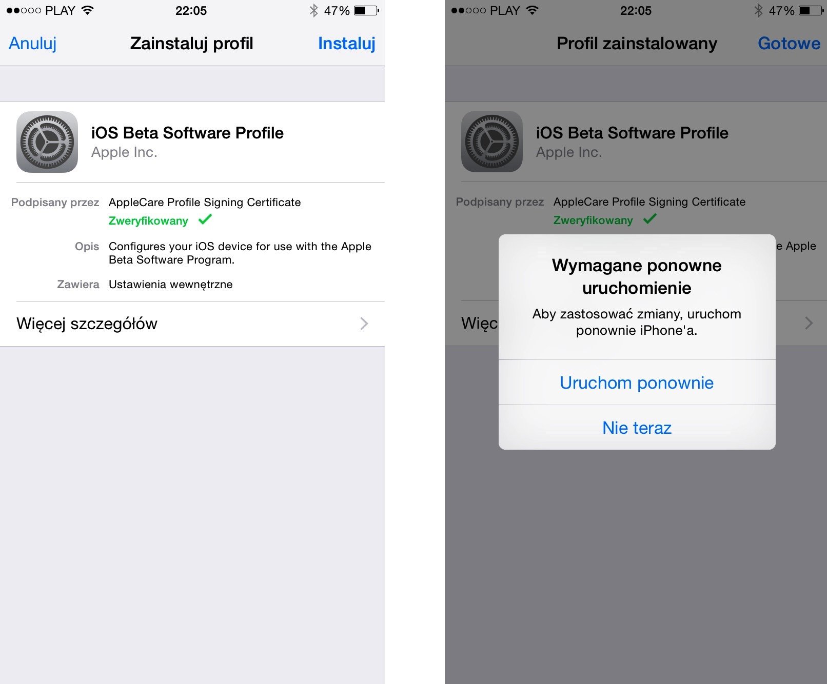 2. Z poziomu iPhone’a lub iPada (poprzez Safari) załaduj tę witrynę. Zostanie wówczas wyświetlona strona instalowanego iOS Beta Software Profile, gdzie trzeba będzie wybrać opcję w górnym rogu Instaluj. Gdy profil zostanie zainstalowany, pojawi się komunikat, że potrzebne jest ponowne uruchomienie urządzenia, na co oczywiście trzeba się zgodzić.