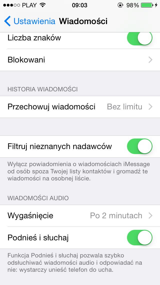 Aby więc poprawić organizację wiadomości w oprogramowaniu iOS 8.3, wejdź w ustawienia aplikacji Wiadomości oraz aktywuj funkcję Filtruj nieznanych nadawców. Sprawi to, że nie będziesz otrzymywał powiadomień o wiadomościach od użytkowników widniejących na liście z niezapisanymi numerami: