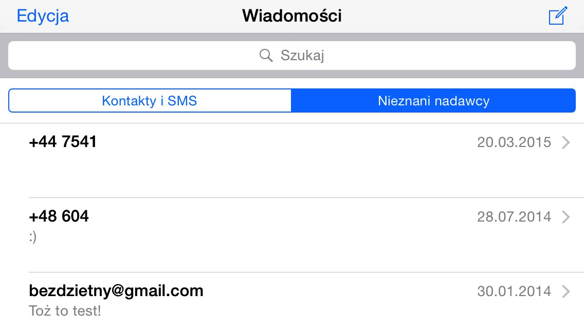 Swojego czasu mówiło się o tym, że na użytkowników iMessage, jako że posługują się adresem mailowym, czyha niebezpieczeństwo w postaci spamu. I faktycznie co poniektórzy skarżyli się na forach, że otrzymują mnóstwo niechcianych wiadomości, więc byli zmuszeni do dezaktywacji komunikatora Apple’a. Inżynierowie z Cupertino najwyraźniej postanowili coś z tym zrobić, ponieważ o ile iOS 8 wprowadził funkcję czarnej listy, o tyle w iOS-ie 8.3 wprowadzono możliwość raportowania niechcianych wiadomości oraz podzielenia skrzynki odbiorczej na wątki rozmów z zapisanymi kontaktami oraz nieznanymi numerami, tudzież adresami mailowymi.