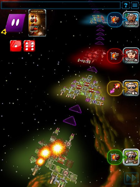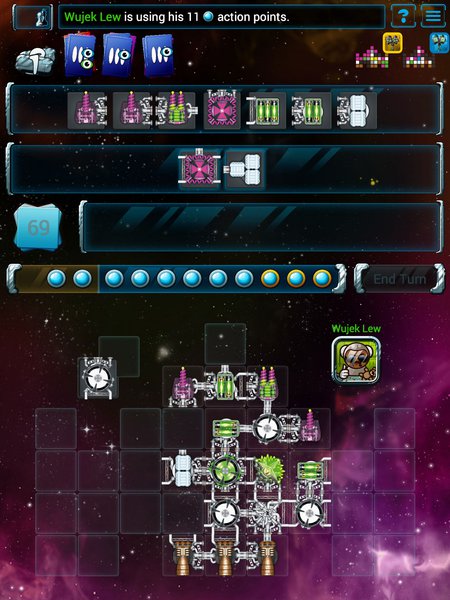 Wspomniałem, że Czesi poszli o krok dalej. Nie tylko w udany sposób przenieśli mechanikę planszówki na ekrany urządzeń mobilnych. Nie chodziło mi również o tryb kampanii, gdyż ten znajdziemy w różnych cyfrowych odsłonach gier bez prądu. W aplikacji otrzymujemy także turowy tryb rozgrywki. Podczas swojej tury dysponujemy dziewięcioma punktami akcji, które przeznaczyć możemy na odsłonięcie nowych kafli, dodanie kafli do statku lub podglądnięcie talii przygód. Przesuwa to akcent rozgrywki ze zręcznościowego w którym odczuwamy presję upływającego czasu, na bardziej taktyczny, w którym możemy przeanalizować spokojnie każdy ruch.