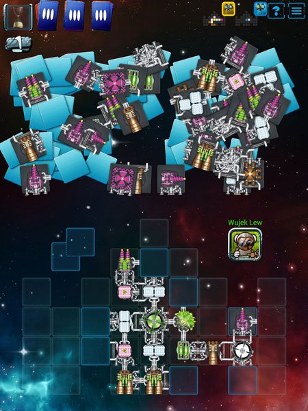 Każdy, kto widział Galaxy Truckera w jego tradycyjnej odsłonie wie, że wymaga on sporo miejsca na stole i kluczowym dla rozgrywki jest łatwy dostęp do puli dostępnych części statku. Dlatego uważam, że to własnie ta część mechaniki stanowiła największe wyzwanie. Stworzenie aplikacji tak, by dostęp do poszczególnych kafelków (nawet tych leżących pod innymi) był szybki i prosty. I ku uciesze wielu osób udało się to znakomicie. Choć mogło to się wydawać niemożliwe, za każdym razem bez problemu sięgamy po upatrzony kafelek, a jego umiejscowienie na naszym statku przebiega bardzo sprawnie. Zarówno grając w trybie multiplayer jak i przeciwko komputerowi całą swoją uwagę możemy skupić na budowie ciężarówki a nie obsłudze aplikacji. Wielkie brawa dla Czechów, tym bardziej, że poszli o krok dalej….