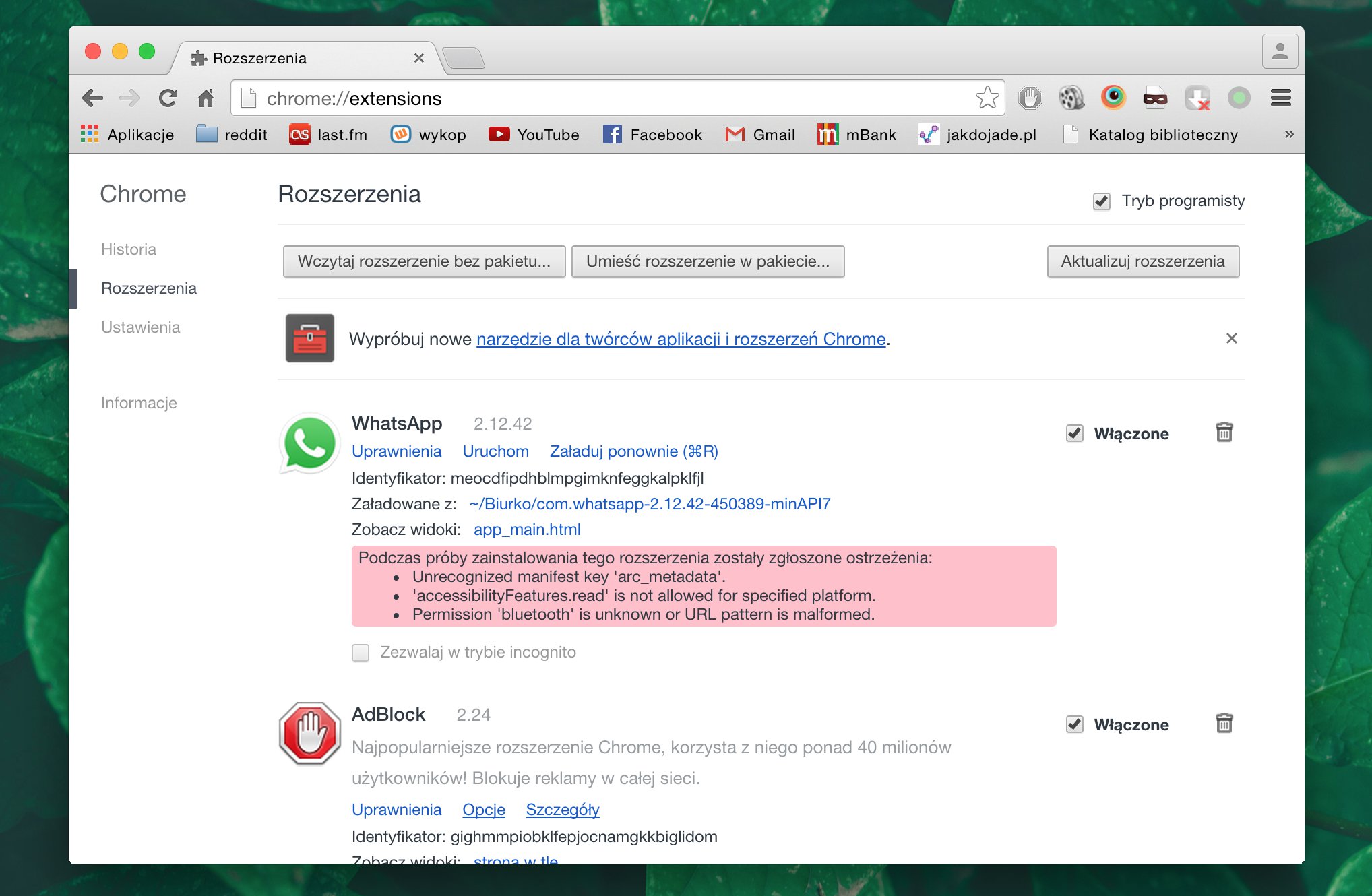 5. Naciśnij Wczytaj rozszerzenie bez pakietu… po czym wskaż folder z wypakowaną w punkcie 3. zawartością. Gdy aplikacja zostanie załadowana, naciśnij pod jej opisem przycisk Uruchom, aby ekran – w tym przypadku WhatsApp Messengera – pojawił się na monitorze.