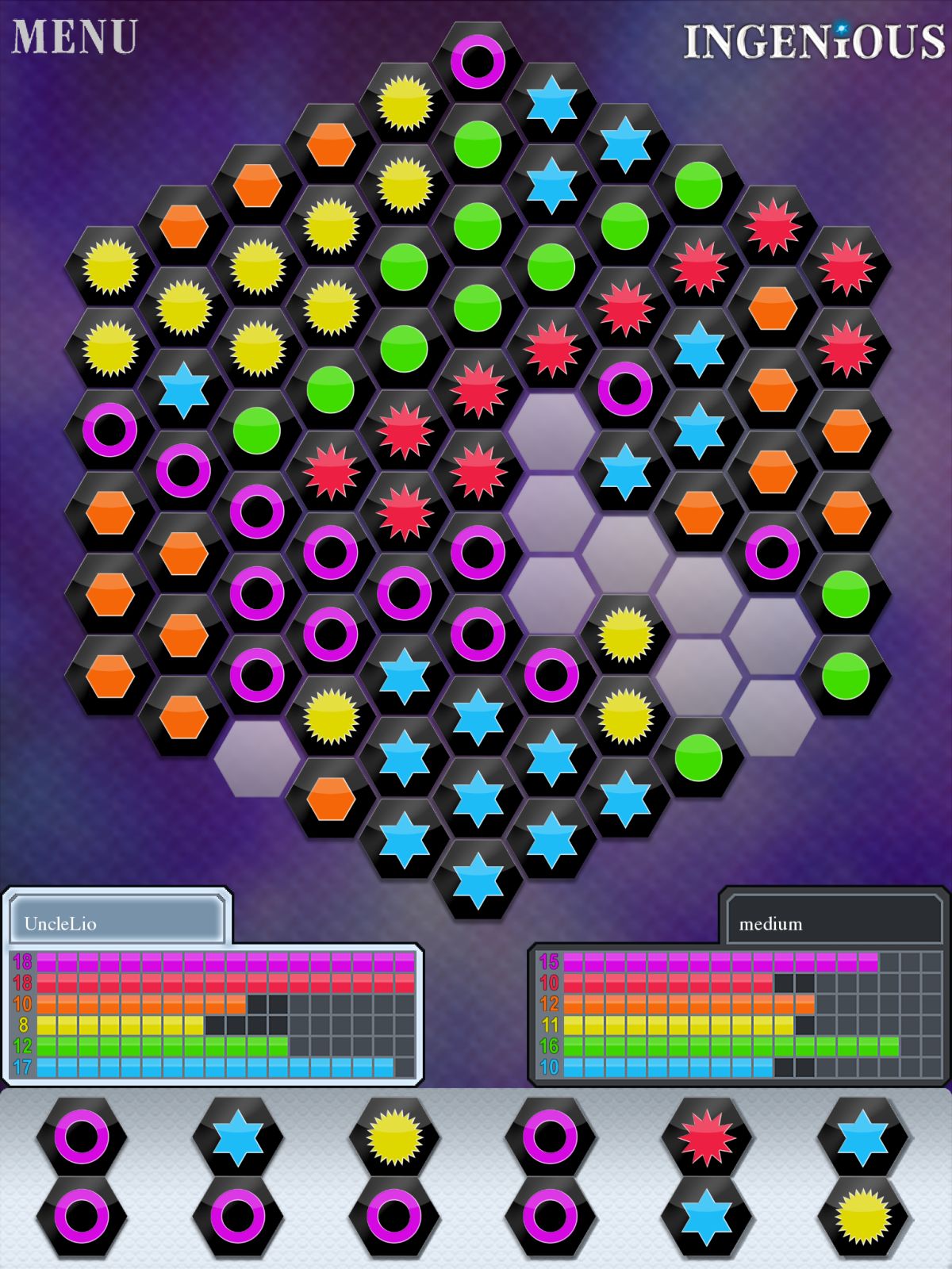 Ingenious to adaptacja jednej z najlepszych gier Reinera Knizii. Polega ona na układaniu kolorowych kafelków na planszy, przypominającej plaster miodu. Geniusz tego tytułu kryje się w systemie punktacji, gdyż wygrywa ten, kto będzie miał najwięcej punktów z koloru, z którego ma najmniej punktów. Brzmi bardzo zawile, ale w praktyce jest to proste, a biorąc pod uwagę, że w grze występuje 6 kolorów, gracze z jednej strony dążą do jak największej liczby punktów (i osiągnięcie bonusu wynikającego z tytułowego „Ingeniousa”), z drugiej muszą pamiętać o konieczności zrównoważonego rozwoju… Jednak w tym wypadku pamiętajcie: granie w analogową wersję gry Ingenious jest wygodniejsze, a do aplikacji warto sięgnąć, by poznać zasady i zrozumieć system liczenia punktów.