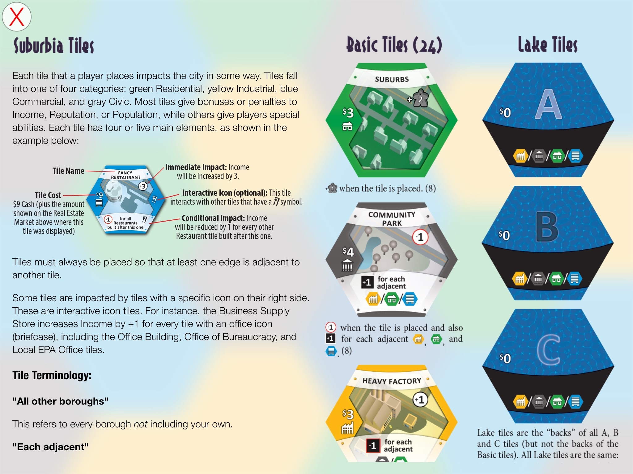 W Suburbii każdy z graczy rozbudowuje własne miasto, dokładając kolejne kafle symbolizujące poszczególne strefy i budowle. Zaczynamy skromnie, posiadając jeden park miejski, jedną fabrykę i osiedle mieszkaniowe. Te zapewniają nam przychód na poziomie zerowym, wzrost populacji na poziomie 1. W kasie naszego miasta też nie ma przepychu: znajdziemy w niej 15 $, które powinniśmy dobrze zainwestować.
