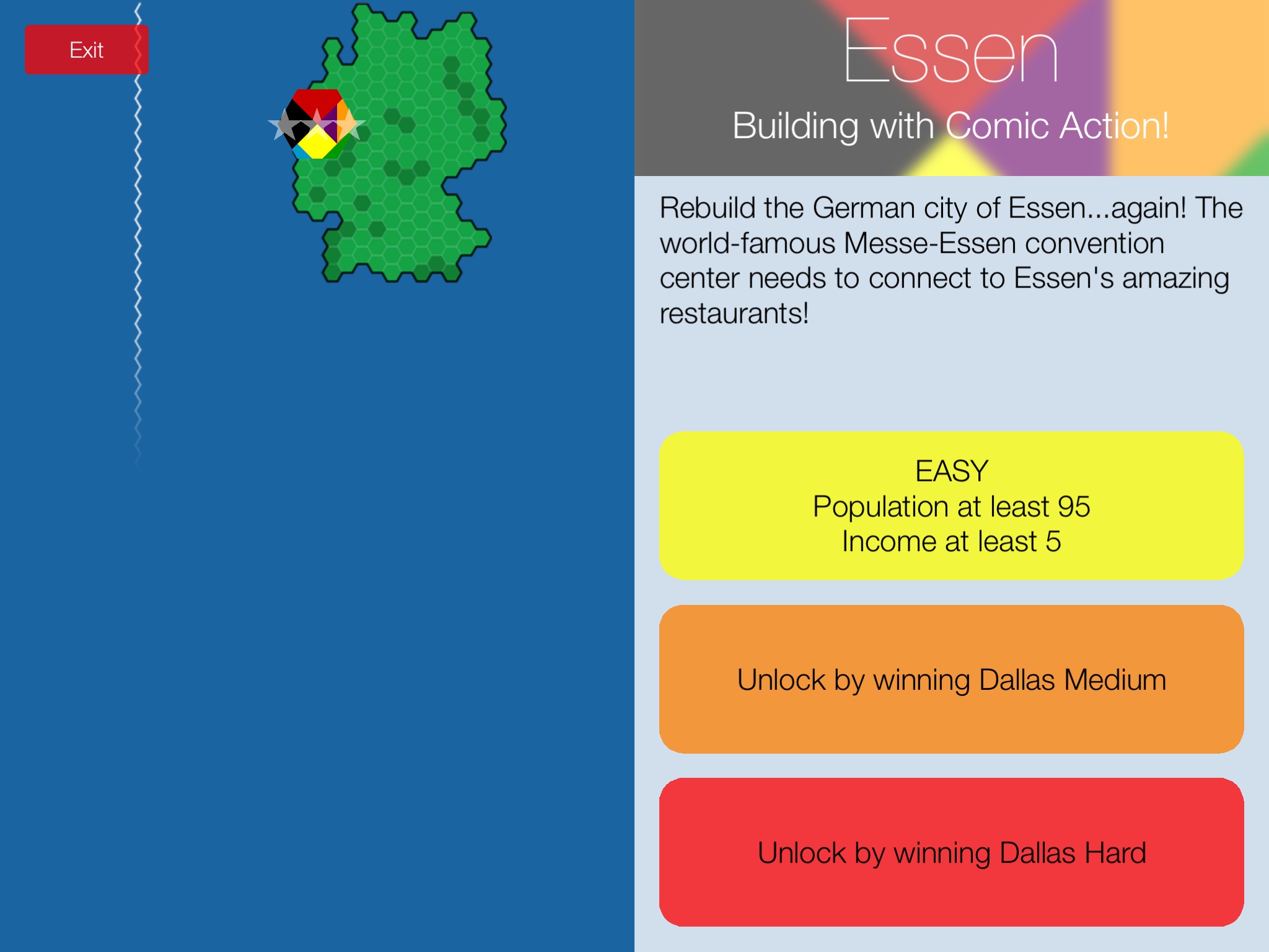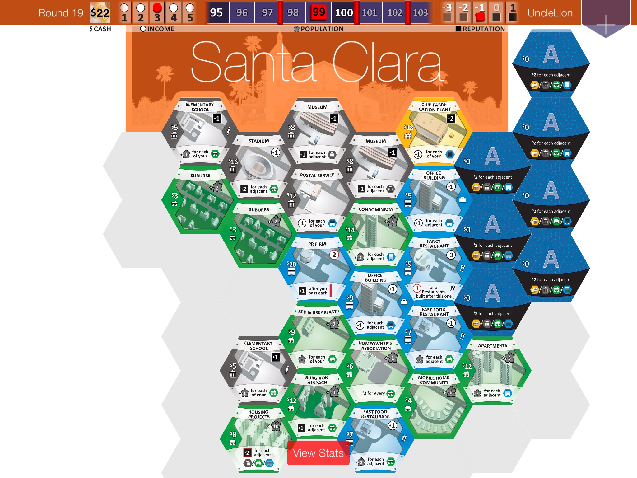 Na ekranie iPada Suburbia prezentuje się dość…. surowo. Graficznie jest niemal identyczna jak planszowa wersja. Początkowo budziło to pewien niedosyt, jednak po pierwszych rozgrywkach doceniłem tą decyzję wydawcy. Dzięki temu rozbudowywane miasto jest czytelne i łatwo ogarnąć wzrokiem ikony na poszczególnych budynkach. Dodatkowo zadbano o wygodny podgląd rynku nieruchomości oraz tabel ze wskaźnikami innych graczy.