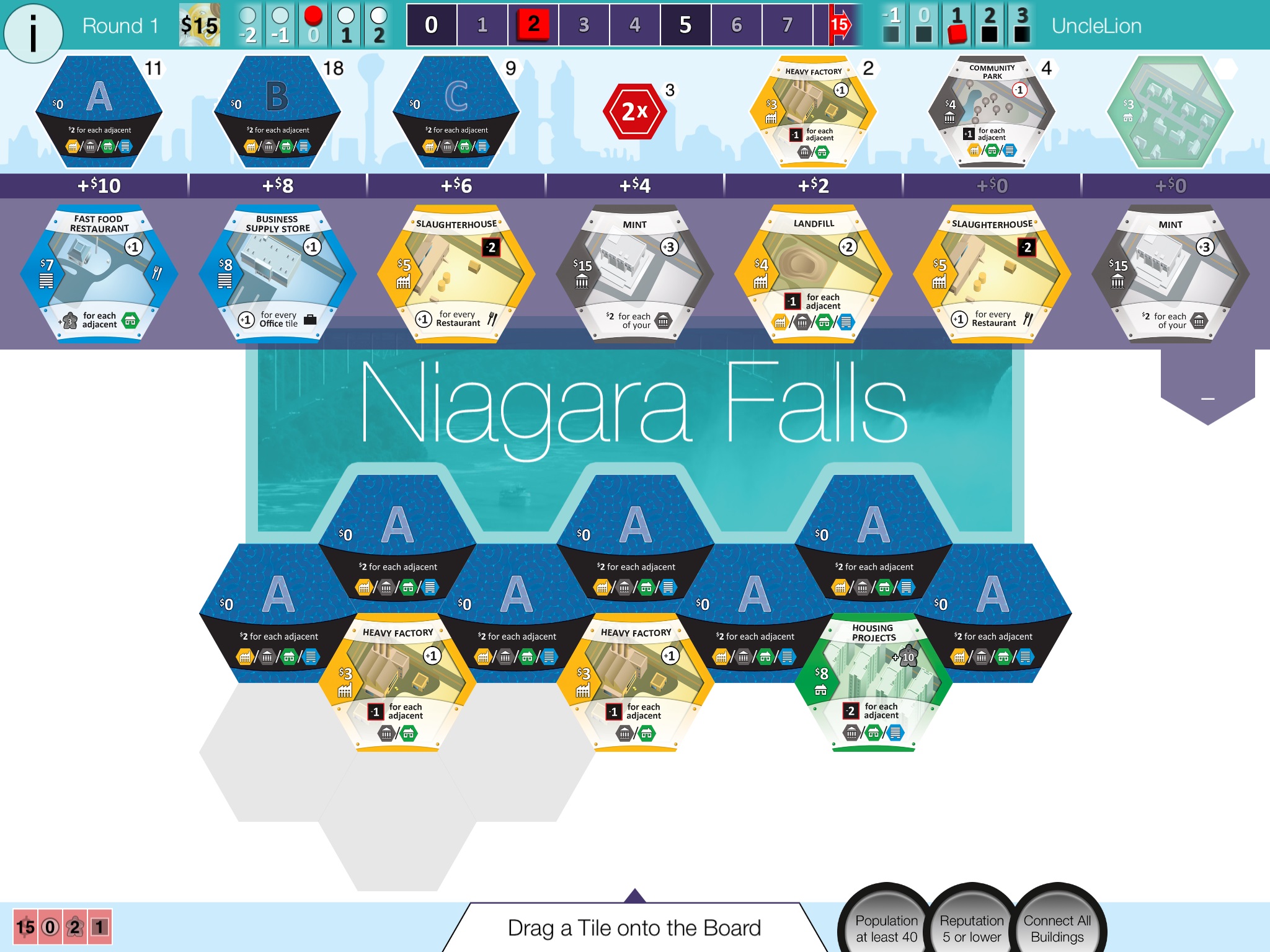 Nowe tereny możemy kupować na rynku nieruchomości. Tam znajdziemy kafle podstawowe (przedmieścia, fabryki i parki) oraz kafle, które będziemy dokładali z trzech zakrytych stosów, symbolizujących także upływ czasu w grze. Cena tych ostatnich uzależniona jest od samej budowli (koszt na kaflu) oraz miejsca na rynku nieruchomości. Z czasem, gdy dana budowla przesuwa się coraz bliżej prawej strony (w miejsce kupionych lub odrzuconych umieszczane są już odsłonięte lub dokładane nowe) ich cena maleje. I tak pojawiają się budowle w kilku kolorach: zielone, będące strefami mieszkalnymi; niebieskie to handel i biura; żółte czyli fabryki, lotniska i autostrady i szare związane z kulturą i edukacją. Jest to o tyle istotne, że kafle na różne sposoby oddziałują na siebie modyfikując dwa wskaźniki: reputacji (czyli tego ilu mieszkańców przybędzie/ubędzie nam na koniec rundy) i przychodu (ile zarobimy).