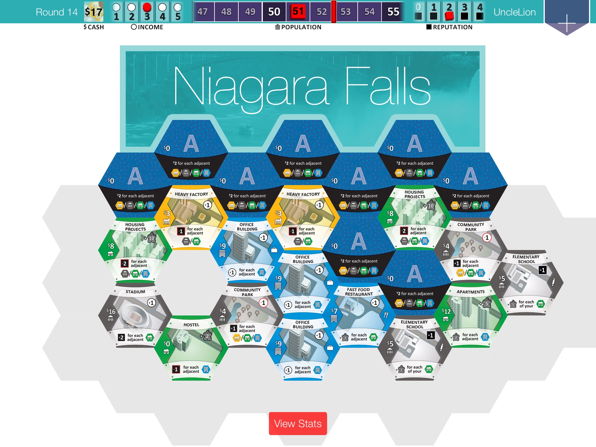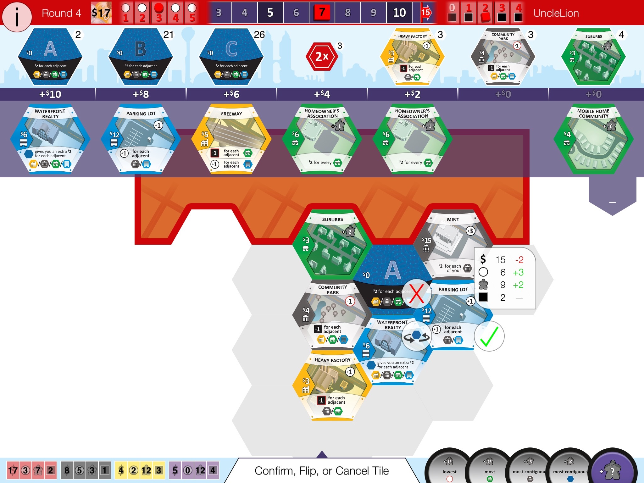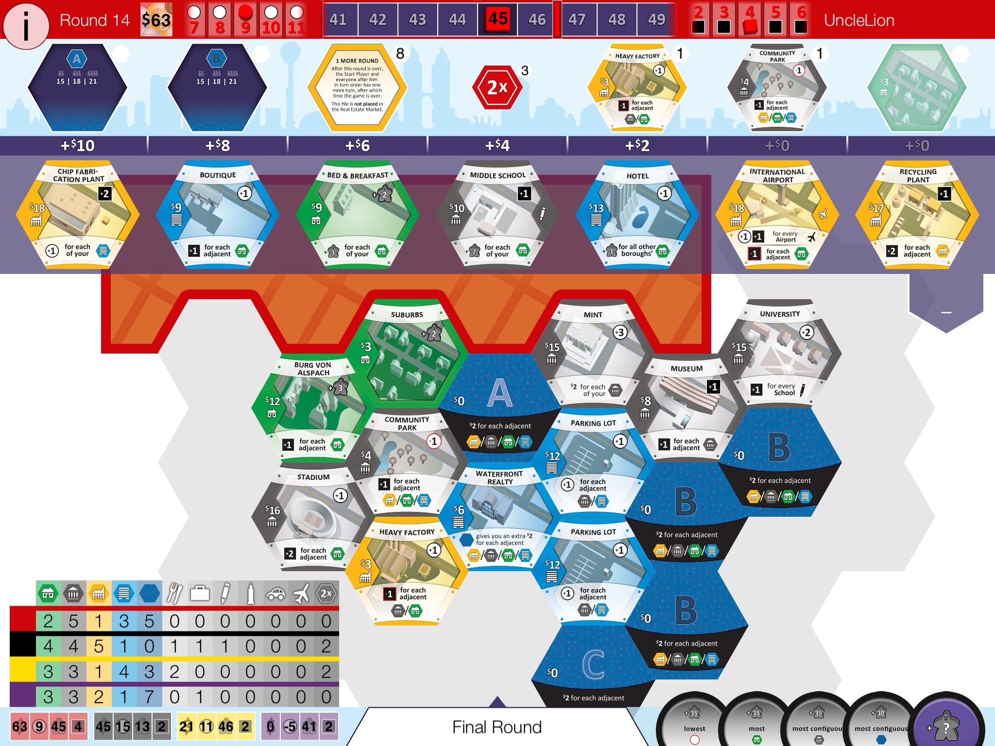 Przed pierwszą rozgrywką, moje obawy budził brak możliwości wyświetlenia wszystkich miast jednocześnie. Interakcja w Suburbii nie jest może duża i głównie skupia się na walce o kafle z rynku nieruchomości. Jednak są kafle, które dają bonusy także z miast przeciwników. Na szczęście po pierwszych rozgrywkach przekonałem się, że nie jest to potrzebne. Wyświetlana w lewym dolnym rogu ekranu tabela (wyświetlić ją możemy klikając na pasek z podstawowymi informacjami), dostarcza wszystkich niezbędnych informacji. I to w formie, która pozwala na jeszcze szybszą analizę sytuacji.