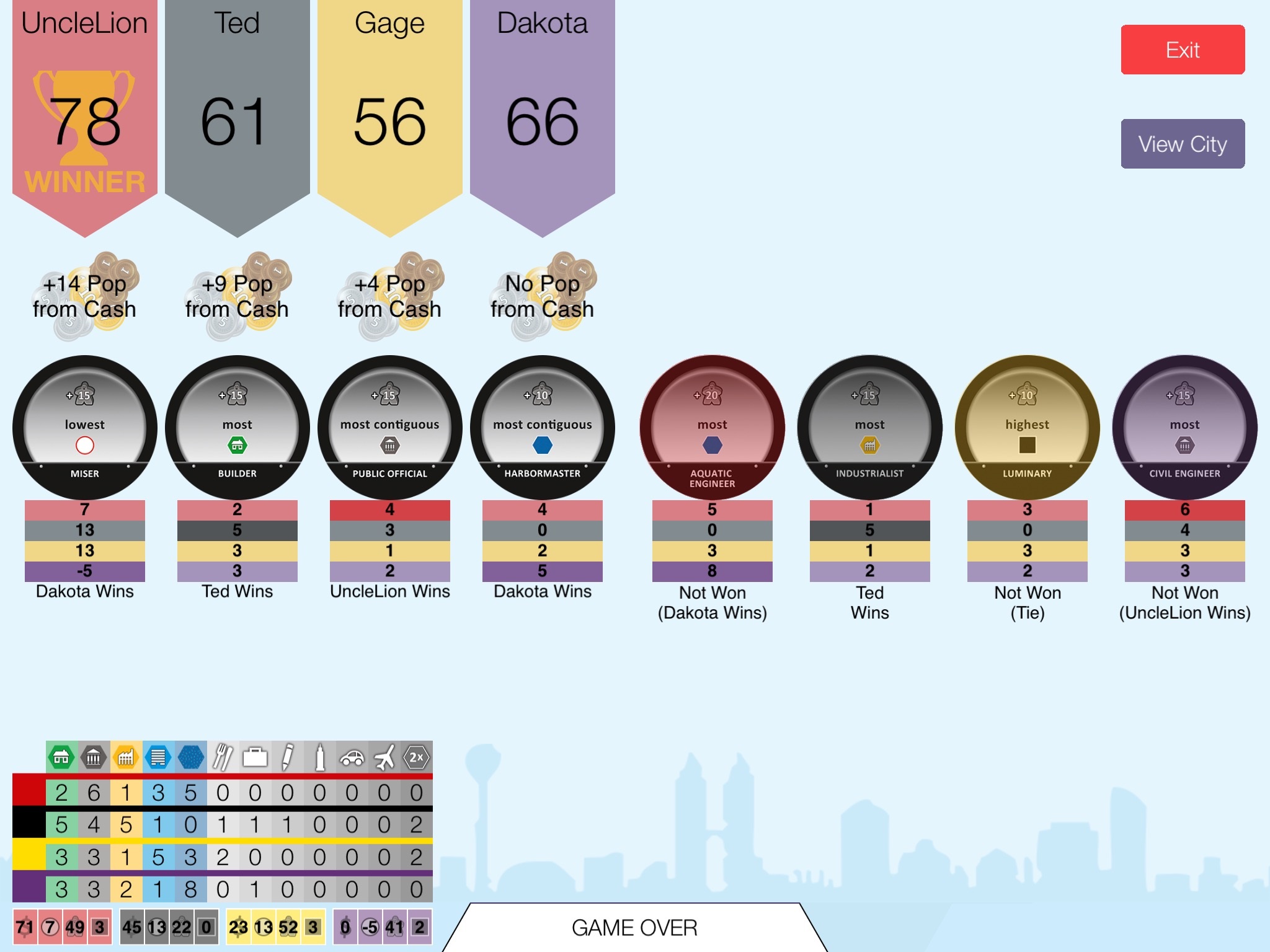 Ostatecznym celem, jak to zazwyczaj ma miejsce w grach, jest zdobycie jak największej liczby punktów zwycięstwa. Wynik to suma liczby mieszkańców, pieniędzy w kasie miejskiej i celów, które losowane są na początku rozgrywki. Część z nich jest jawna i gracze świadomie rywalizują o te punkty. Każdy losowo otrzymuje także jeden cel, którego nie ujawnia innym. Ten komu uda się go zrealizować – otrzymuje dodatkowe punkty.