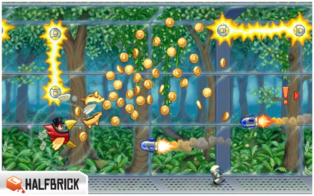 Podobnie zresztą będzie wyglądać kwestia Jetpack Joyride – bardzo prostego endless-runnera od HJalfbrick Studios. Głównym zadaniem grającego jest omijanie pułapek przygotowanych przez naukowców chcących zakończyć nasz żywot. Za wszelką cenę. Oznacza to, że na naszej drodze staną różnego rodzaju śmiercionośne lasery, rakiety, pola siłowe i wiele, wiele więcej. Po drodze zbieramy monety, ulepszamy plecak odrzutowy i pokonujemy kolejne kilometry. I tak bez końca. I to właśnie jest tak naprawdę siła tego pozornie prostego endless runnera – ciągle zmieniające się warunki gry generowane losowo pozwalają na to, by za każdym razem rozgrywka wyglądała zupełnie inaczej.