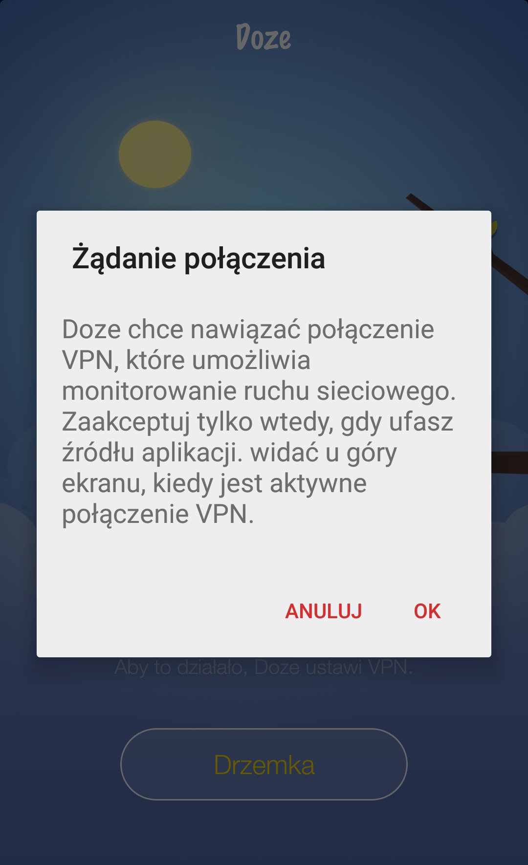 Kiedy klikniemy w Drzemkę, Doze zapyta nas o to czy zezwolimy jej na ustanowienie połączenia VPN w celu monitorowania ruchu sieciowego na naszym urządzeniu. Warto pamiętać, iż to właśnie dane mobilne zużywają najwięcej energii dostępnej w naszym akumulatorze. Klikamy Ok i przechodzimy dalej.
