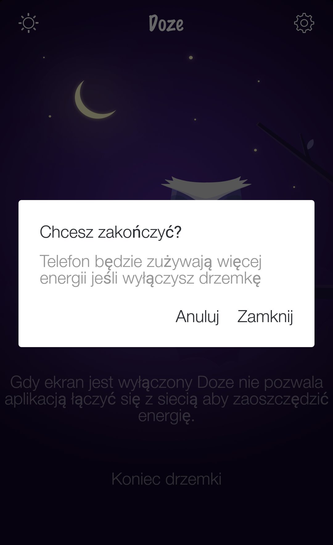 Po zainstalowaniu aplikacji naszym oczom ukaże się ekran, który będzie przedstawiał rysunek sowy na ładnym, kolorowym tle. Jedynym interesującym nas w tym miejscu przyciskiem jest funkcja Drzemki, która pozwoli na przejście do dalszej konfiguracji aplikacji.