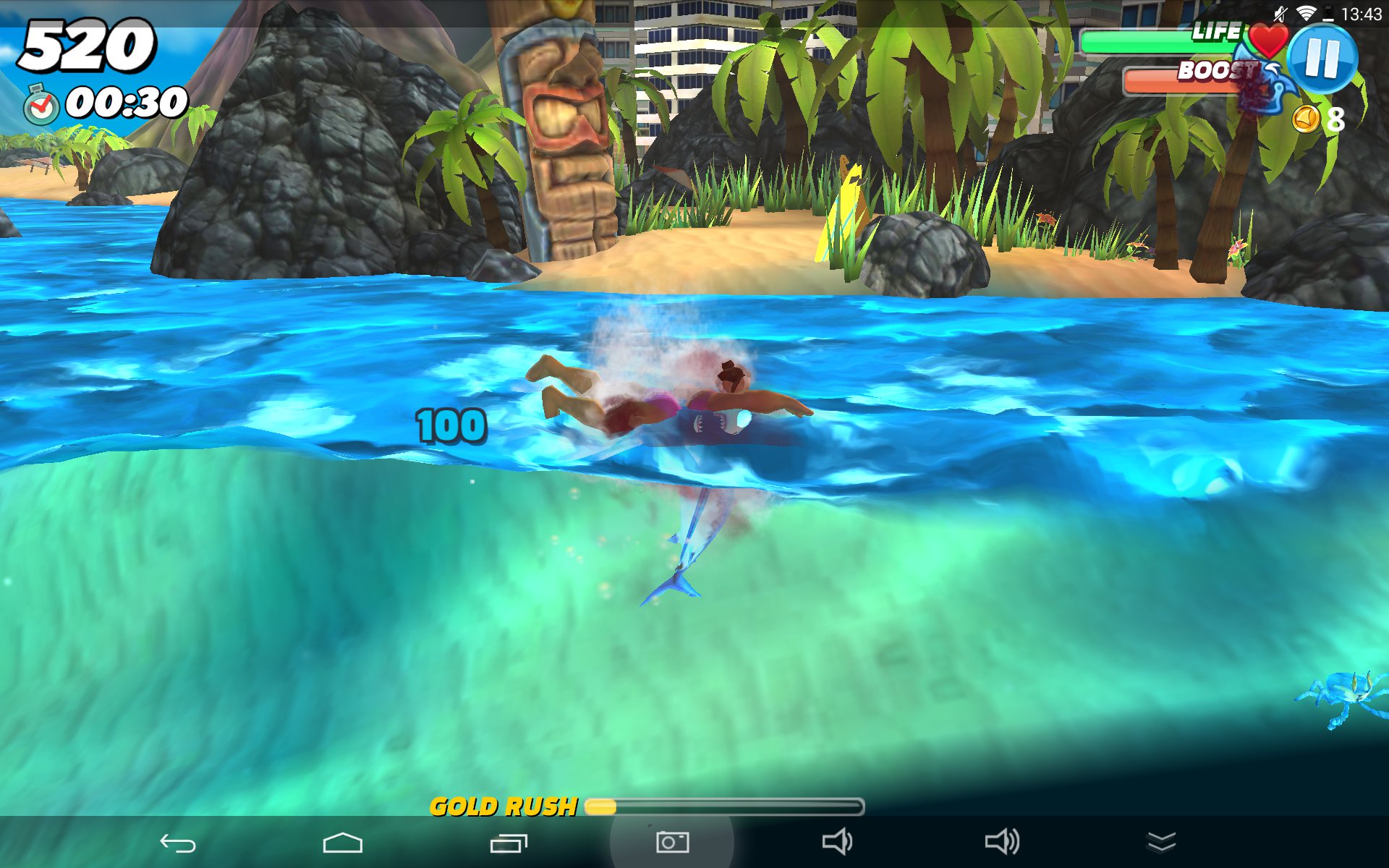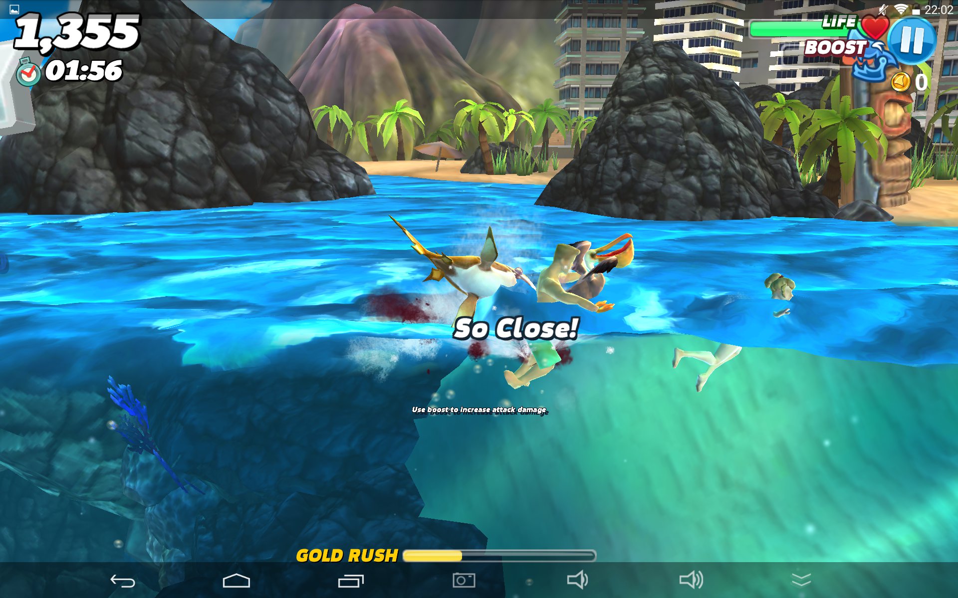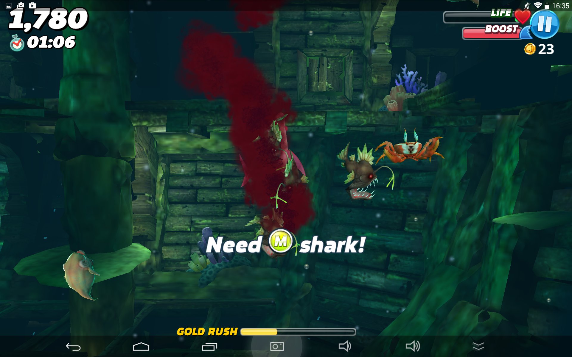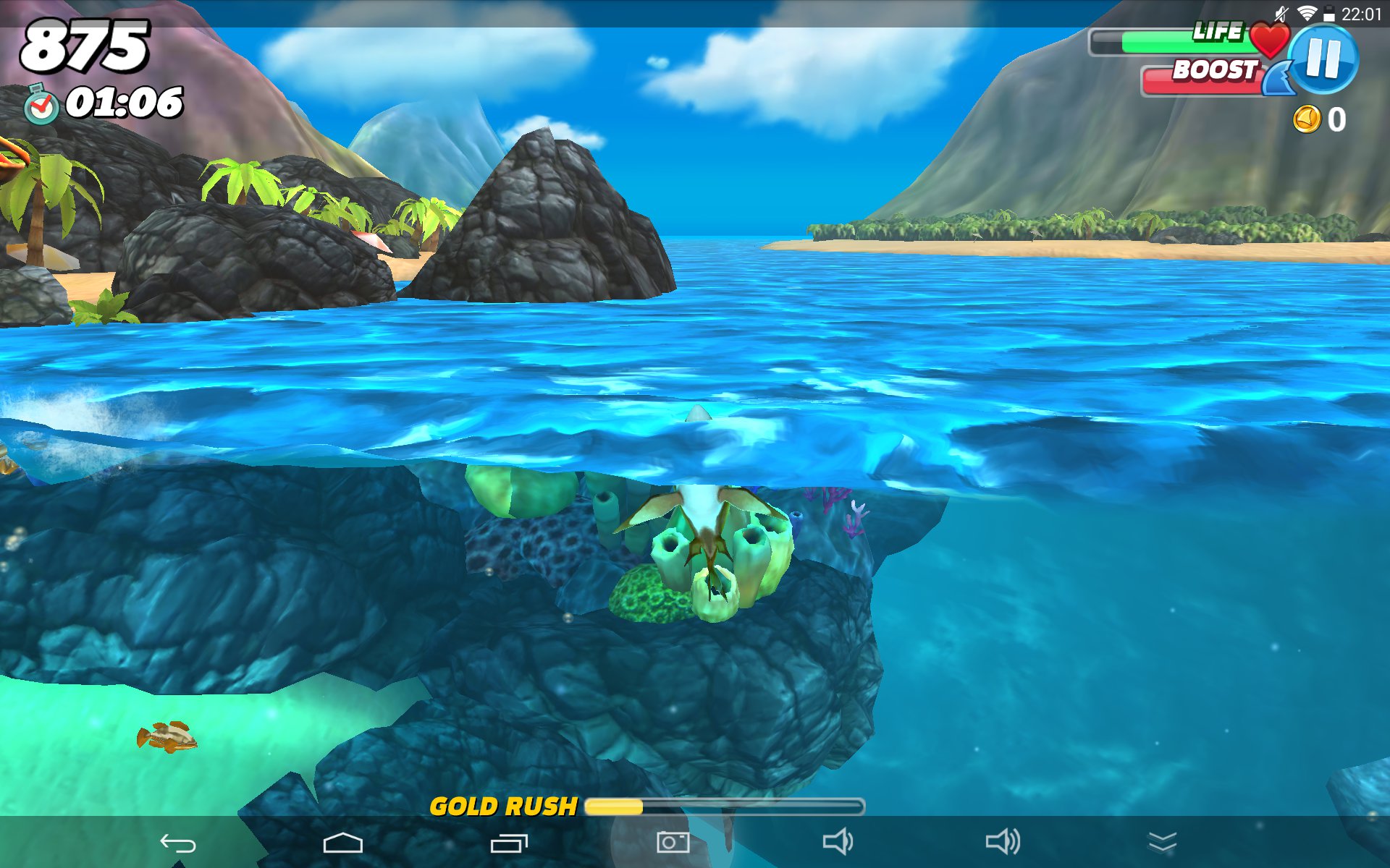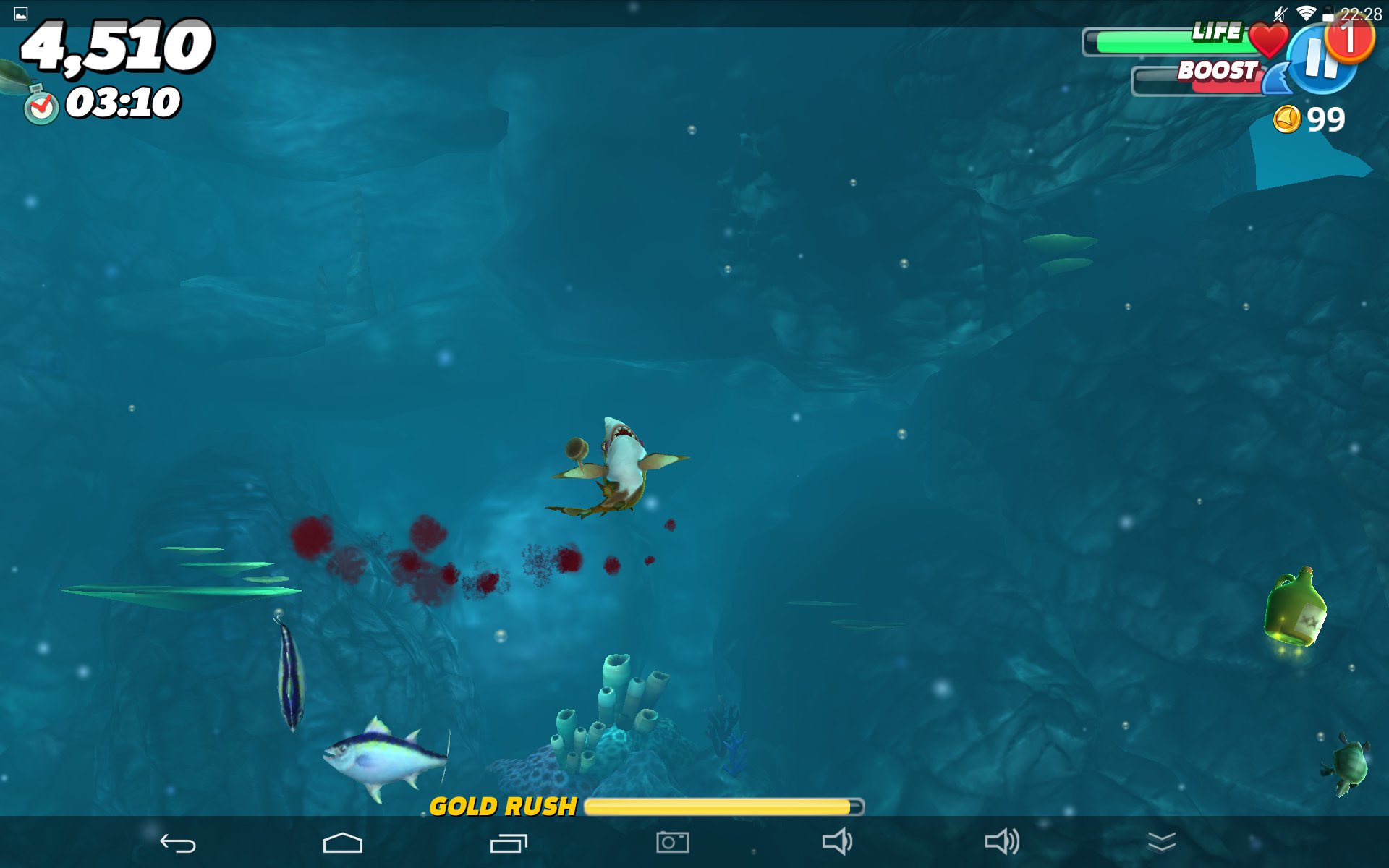 A najśmieszniejsze jest w tym wszystkim to, że w gra się naprawdę całkiem przyjemnie – zestaw ryb i żyjątek jest zróżnicowany, a rozgrywka totalnie nieskomplikowana – musimy jedynie płynąć w kierunku celu i chapnąć nadarzający się pływający kawałek mięsa. Często użyjemy do tego specjalnego boosta, pozwalającego w trymiga zbliżyć się do ofiary lub też uwolnić się od kłów innych rekinów czy agresywnych żyjątek, chcących pozbawić nas szansy na dalszą wyżerkę. Za każdego zjedzonego mieszkańca oceanu otrzymujemy złoto, które możemy wymienić na ulepszenia naszego rekina bądź też wykupienie kolejnych, lepszych postrachów oceanu. Zanim jednak udostępniona zostanie nam takowa możliwość, to czeka nas naprawdę sporo przygód w wodzie.