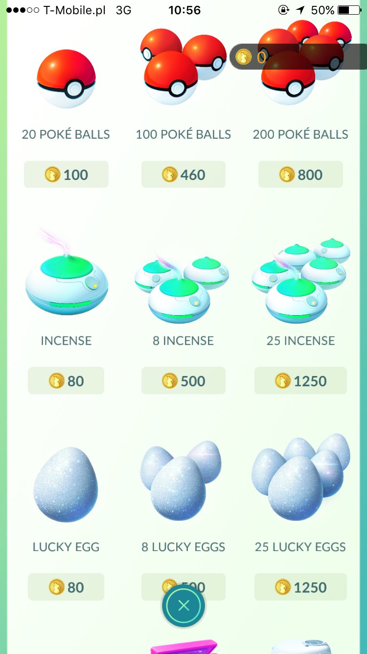 Za zdobyte Pokecoins możemy kupić sobie dowolną rzecz – Pokeballe, Inkubatory, Incense, a nawet powiększenie wielkości plecaka. Wszystko znajdziemy w sklepiku umieszczonym w grze.