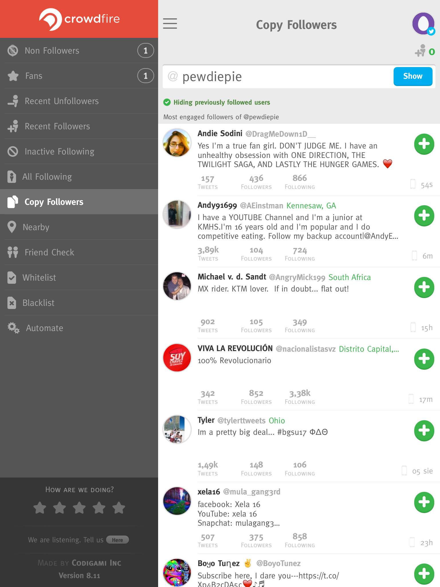 Ponadto wytwórnia Codigami zamieściła w Crowdfire wykazy: nowych fanów, unfollowersów czy przez dłuższy czas nieaktywnych obserwowanych. Zapewniła również możliwość ustalenia preferencji: kogo chcemy obserwować, a kogo kategorycznie nie. Pozwala też na to, by znajdować bliskich naszemu położeniu twórców, aby później nawiązywać z nimi współprace.