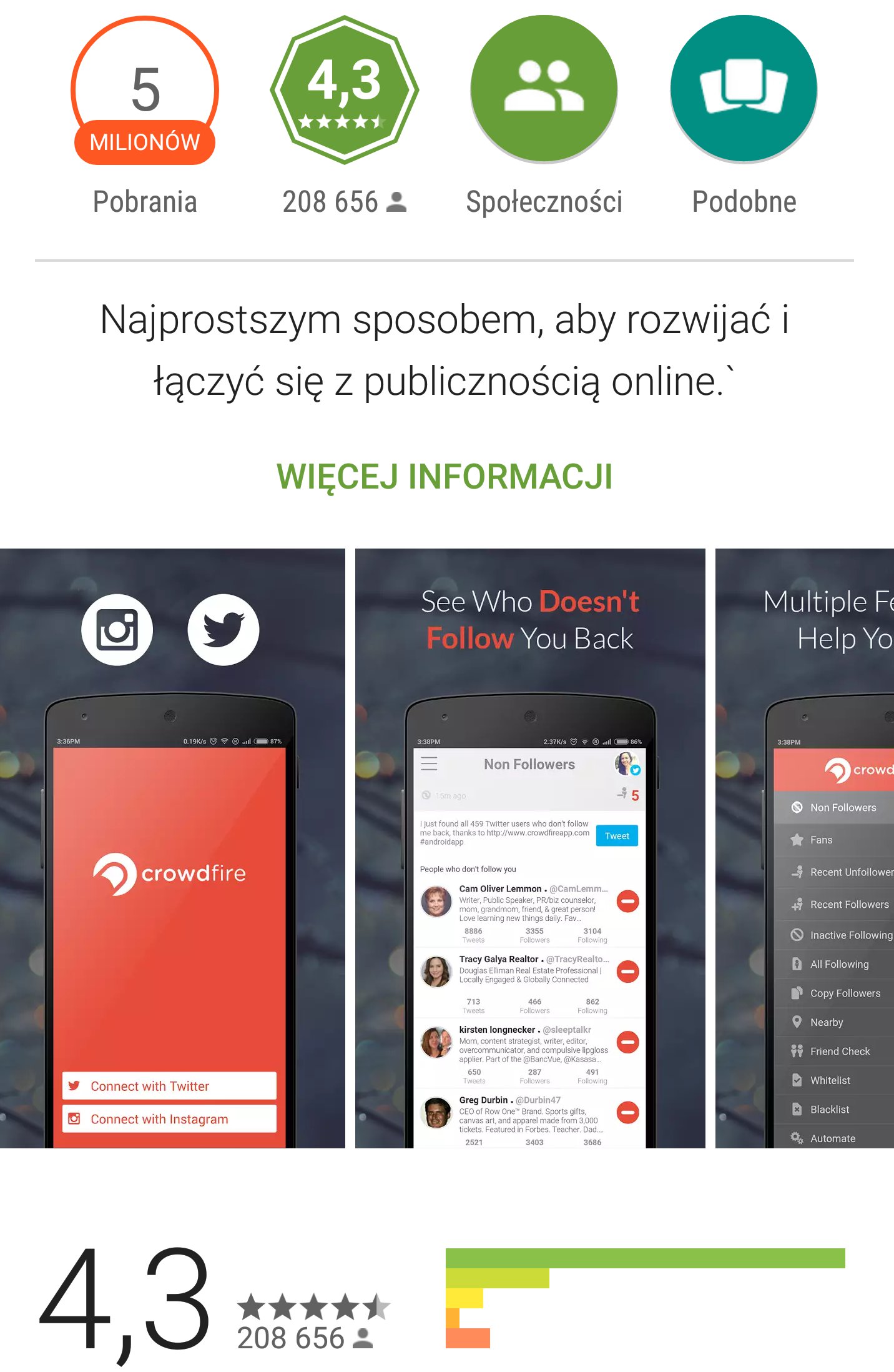 Crowdfire jest zupełnym przeciwieństwem megalomanów i populistów. Nie puszy swoich kolorowych, pawich piórek. Nie obiecuje nam spektakularnego sukcesu. Nie musi zniżać się do poziomu serwowanego przez marketingowców z telezakupów próbujących wcisnąć nam plastry oczyszczające z toksyn. Aplikacja po prostu broni się setkami tysięcy pozytywnych opinii.