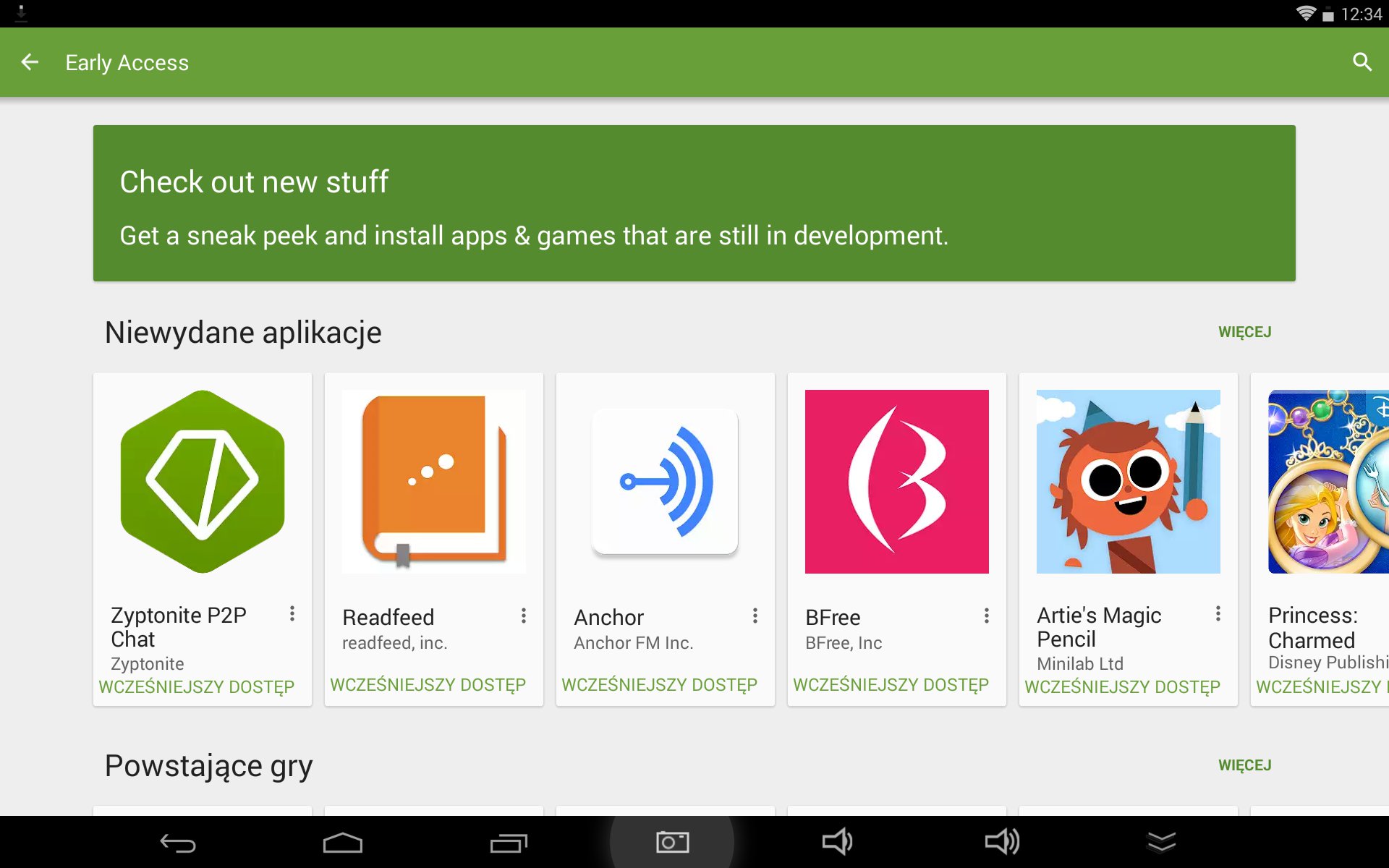 Gry i aplikacje w ramach „Wcześniejszego Dostępu” pojawiają się w ofercie Google Play już od kilku miesięcy. Cała sekcja podzielona jest na dwie części – jedną poświęconą grom, drugą – aplikacjom. Narzędzie na razie jest dość solidnie limitowane i ograniczone do dość niewielkiej grupy deweloperów, co skutkuje naprawdę niewielką ilością programów, które trafiają do naszych rąk za darmo z możliwością wypróbowania ich wczesnej, nieukończonej jeszcze wersji. W przypadku aplikacji mamy szansę pobrania sześciu aplikacji, z kolei gier jest nieco więcej, bo jedenaście.